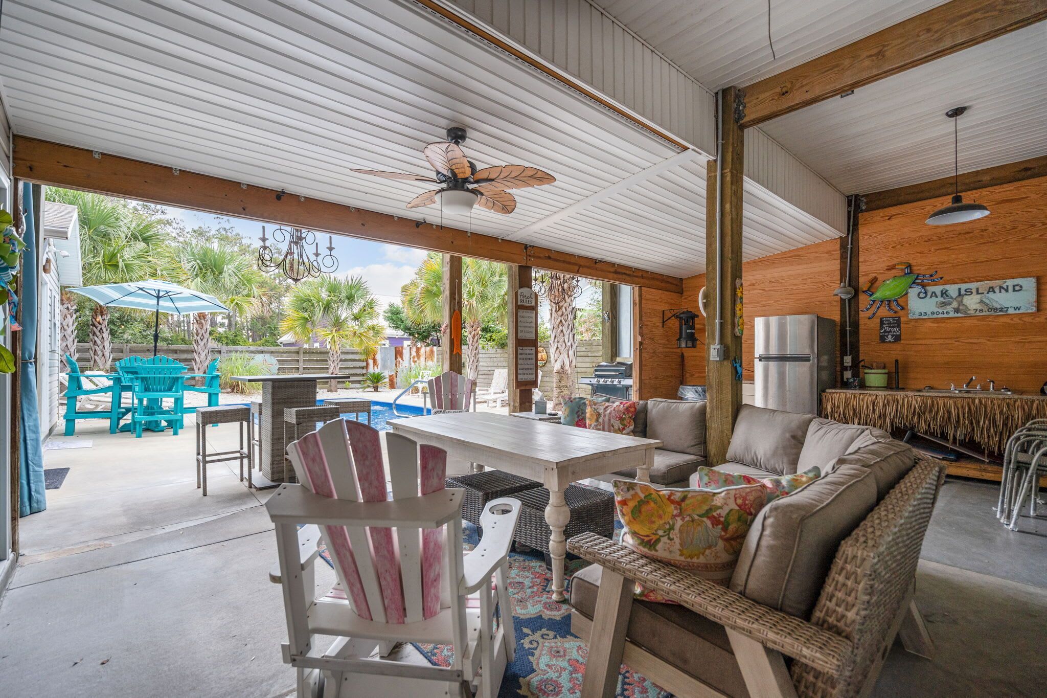 Plenty of private, covered parking and a large drive pad 4-6 vehicles or a boat and trailer, no problem. Outdoor hot and cold shower. Exterior front and back stairwells. 7 piece outdoor seating vignette in shaded, under-house patio.