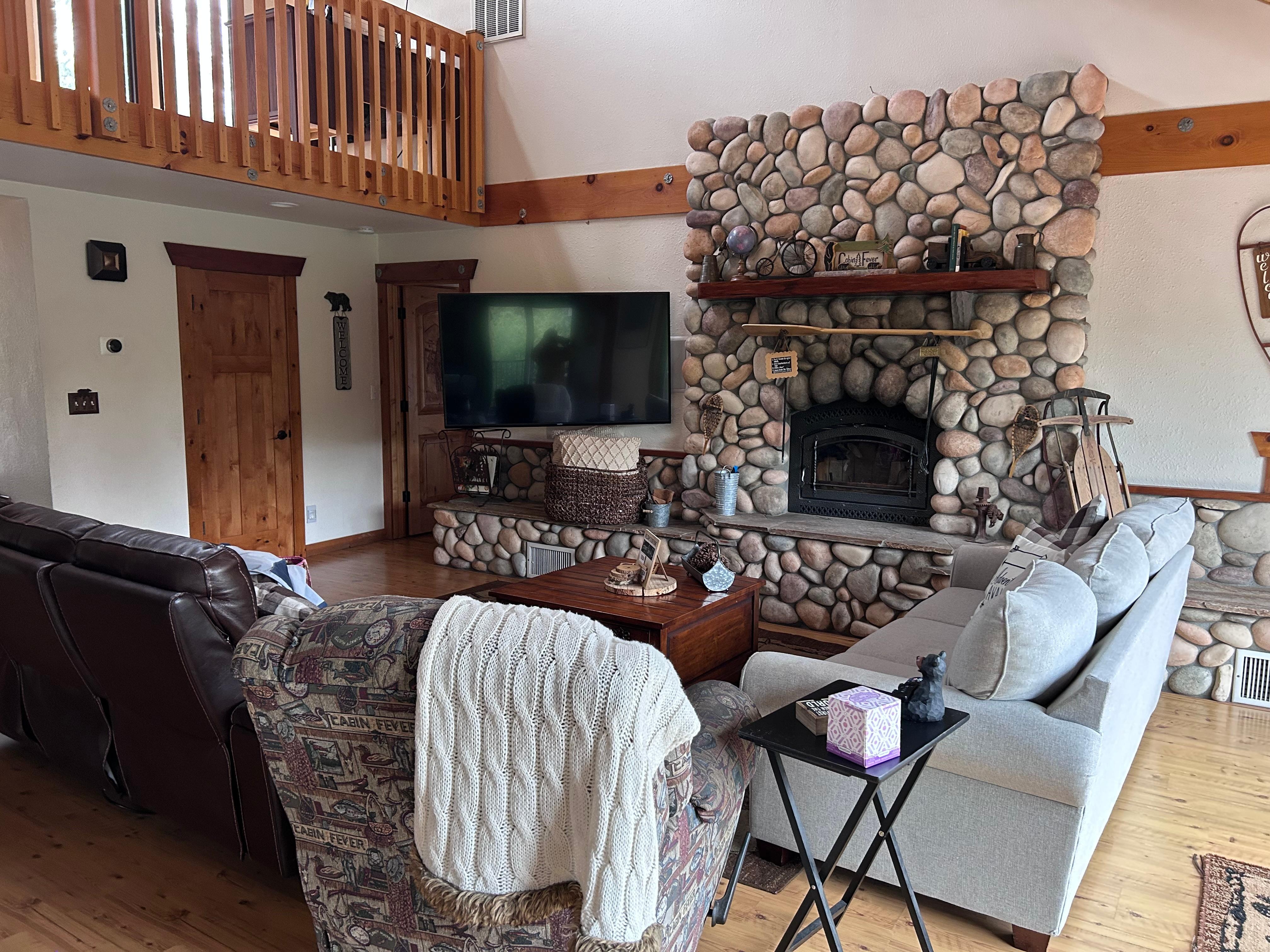 The living room includes two large sofas, a large Smart TV with apps, and a functioning wood burning stove.