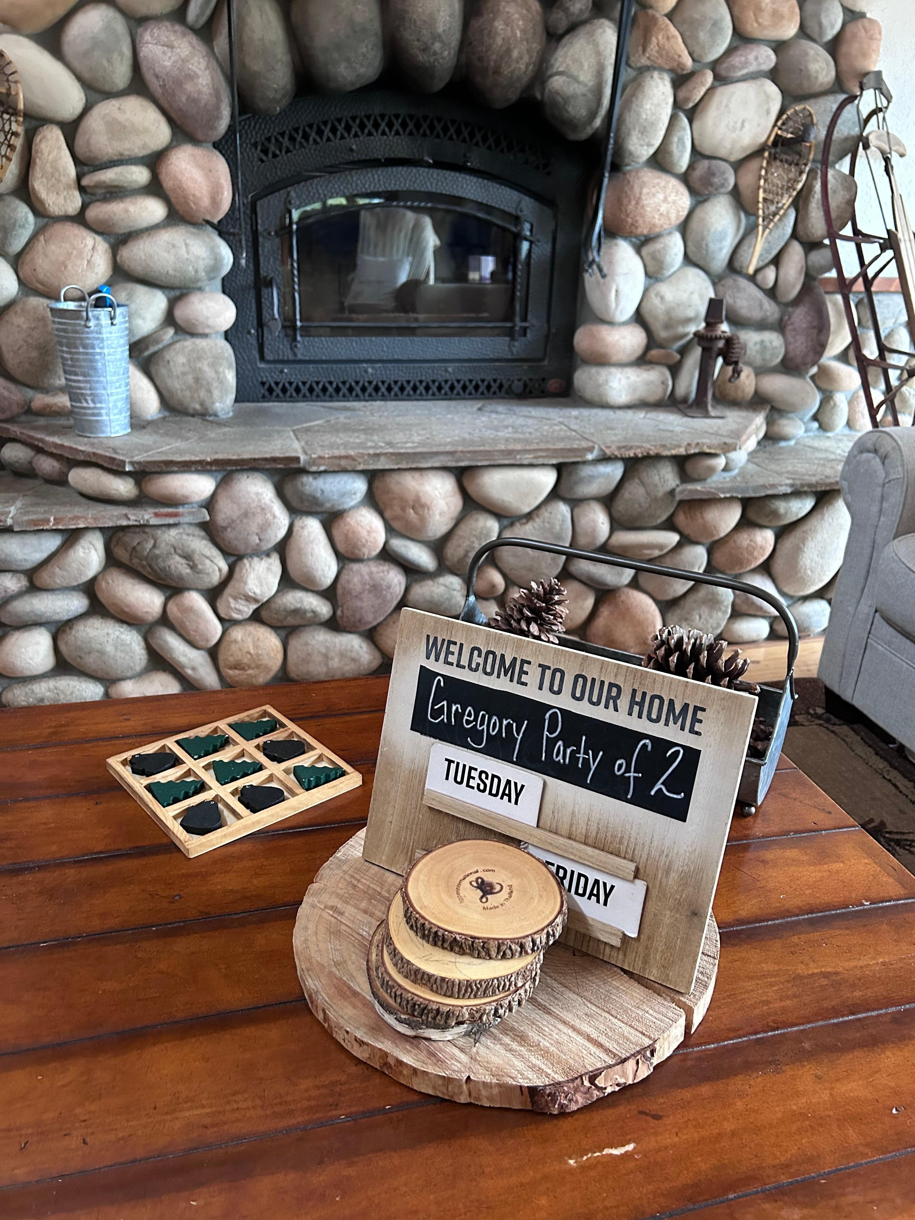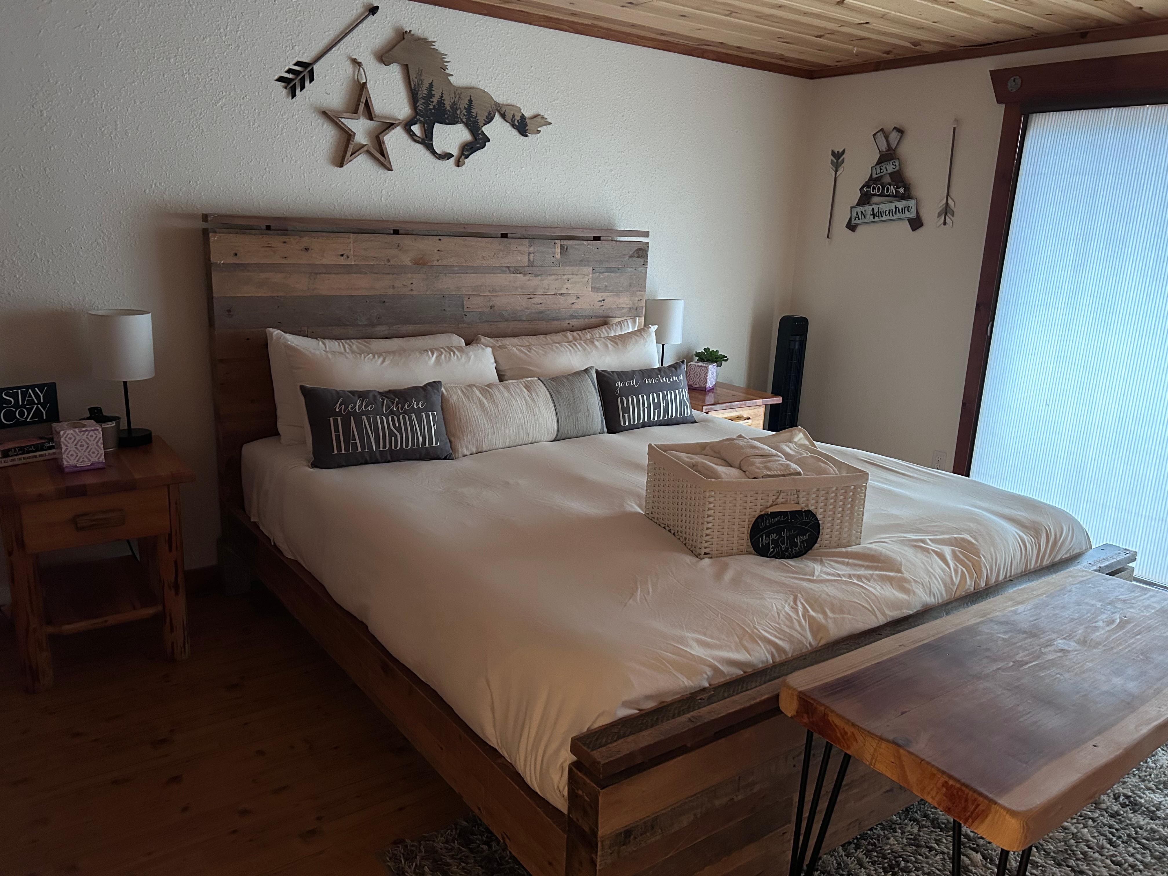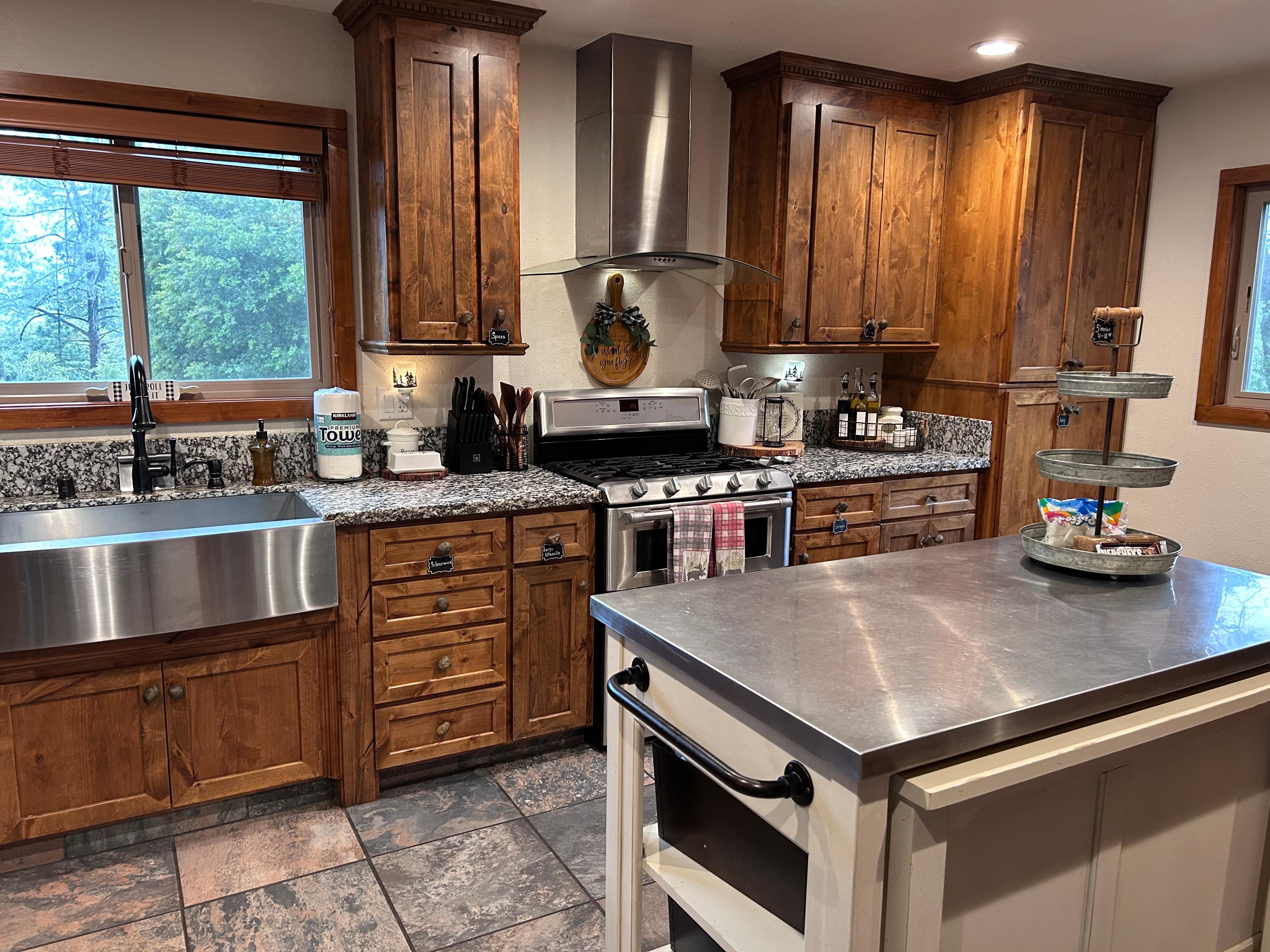 Enjoy preparing meals in a fully stocked chefs kitchen with all the cookware, dinnerware and spices necessary to whip up something delicious. Enjoy dining in a stunning dining room that seats 8 or out-door dining on a high top dining table with fire-pit.