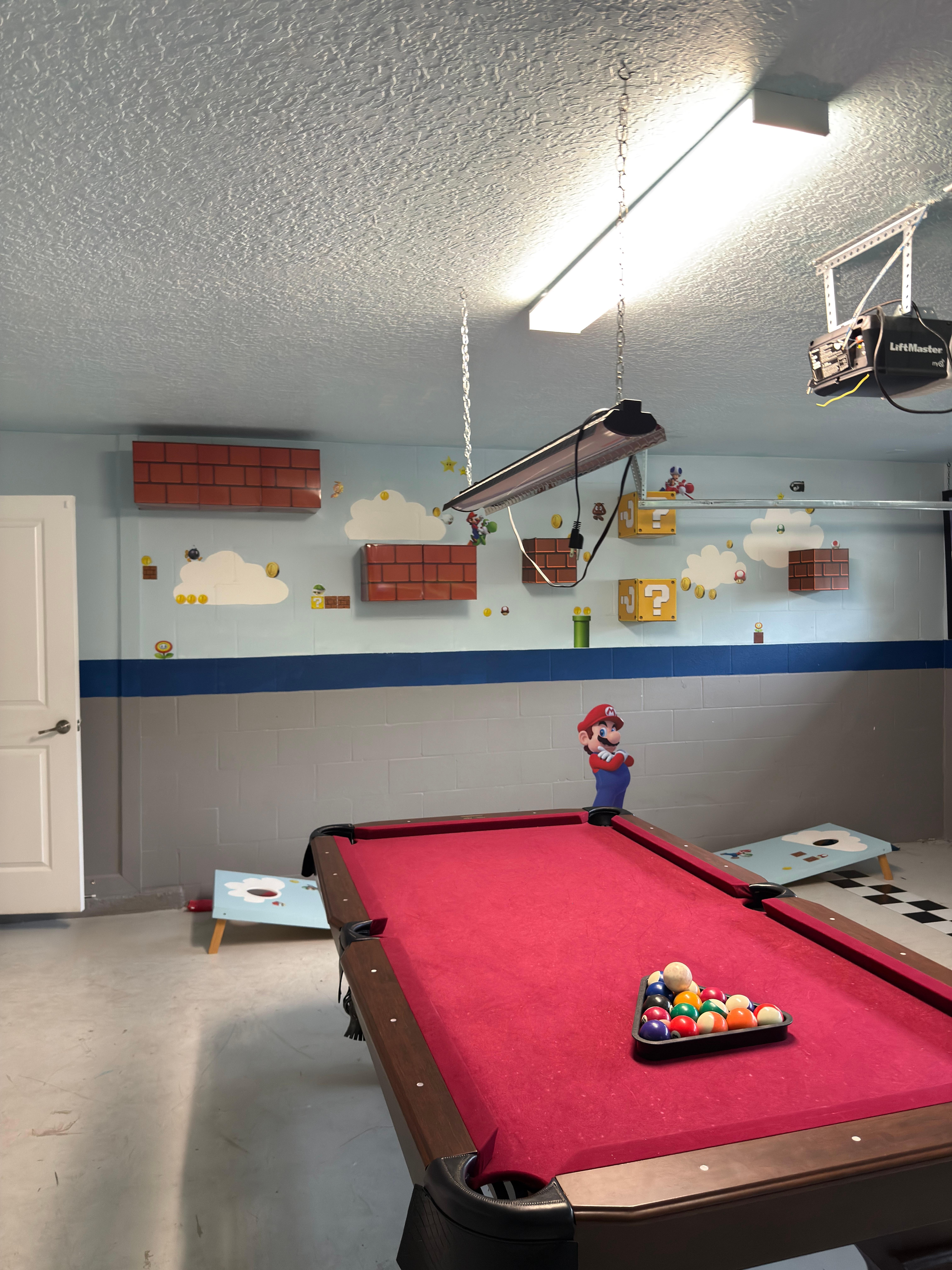 Games room with Pool table, two arcade games, cornhole game, dart board, Tv with a few bar chairs as well. All done up with a Super Mario Bros. theme.