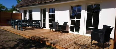 This exclusive holiday home features a natural thatched roof and offers over 100 m² of pure relaxation. Flooded with light, cozy, including underfloor heating and a fireplace... what more could you want :-) Furthermore, you'll find 2 bathrooms, 2 bedrooms, 2 terraces, and a thatched lounge area. You can safely store your bicycles in the garden house provided for your use. Just chill out for a day in the beautiful garden and enjoy the spacious beach chair... so much is possible! With the fiber optic connection from Telekom, you can even work on your projects from your home office on the Baltic Sea.