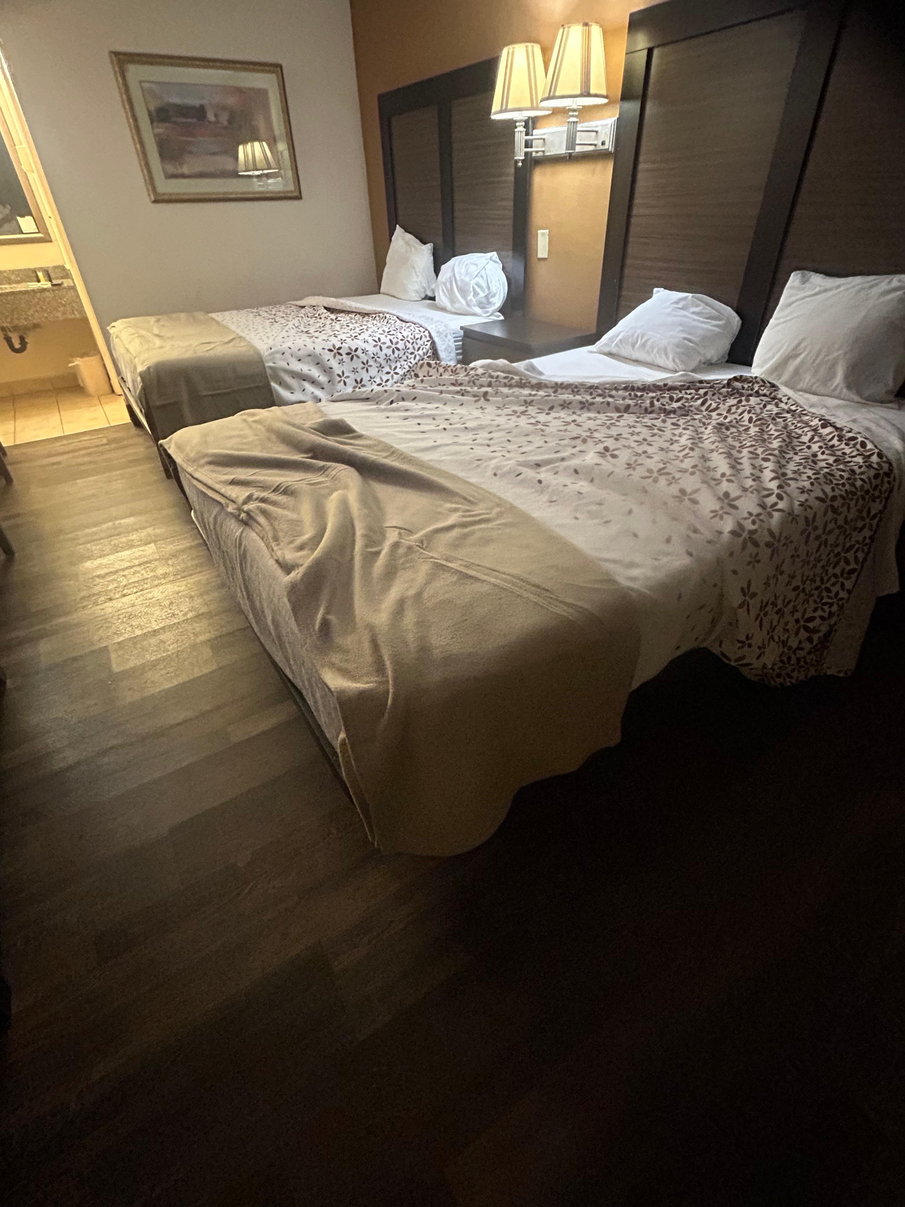 Only nice staff was Marley who worked nights. The 1st room was crawling with bugs, 2nd room stains and uncleaned 3rd room was ok just needed swept and mopped and new linen on 1 bed (stains so played it safe). Couldn’t switch hotels wasn’t one available. Microwave was broke, air went out next day and the nice maintenance man got yelled at a lot!