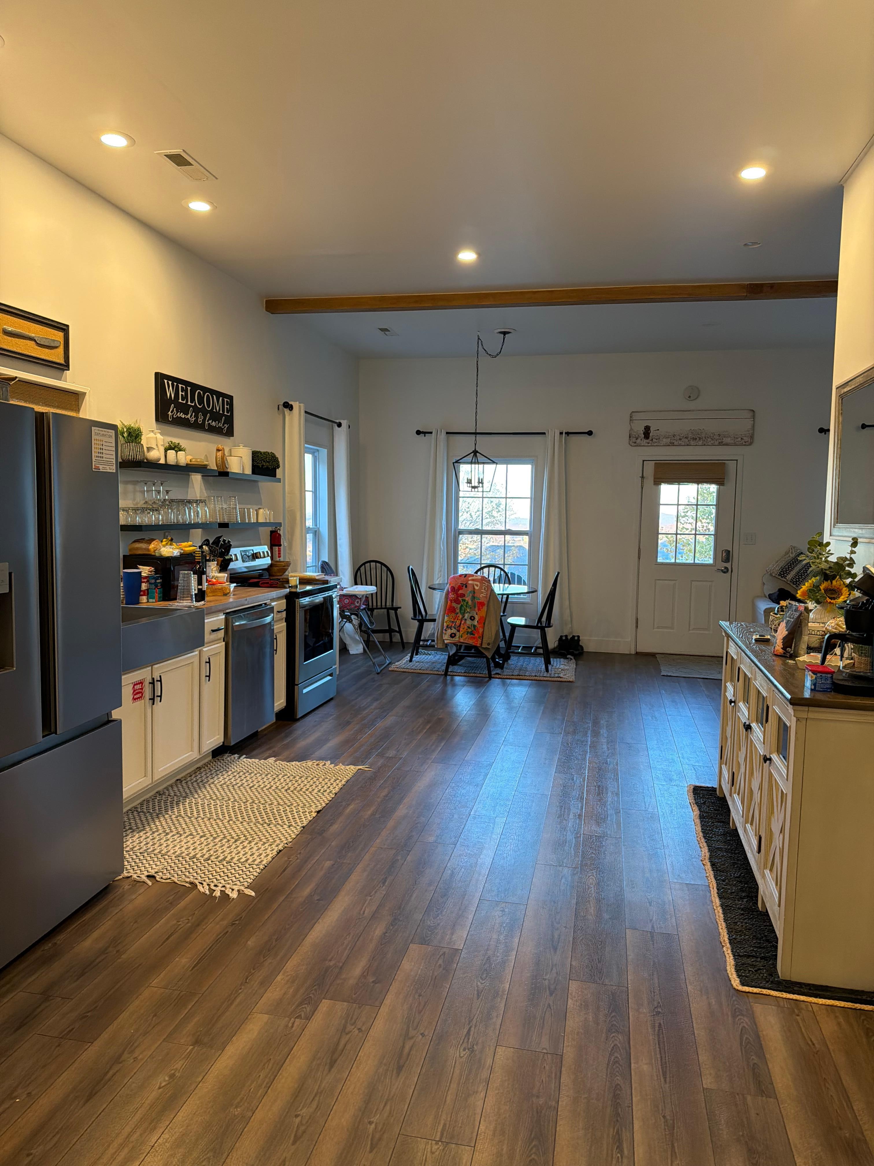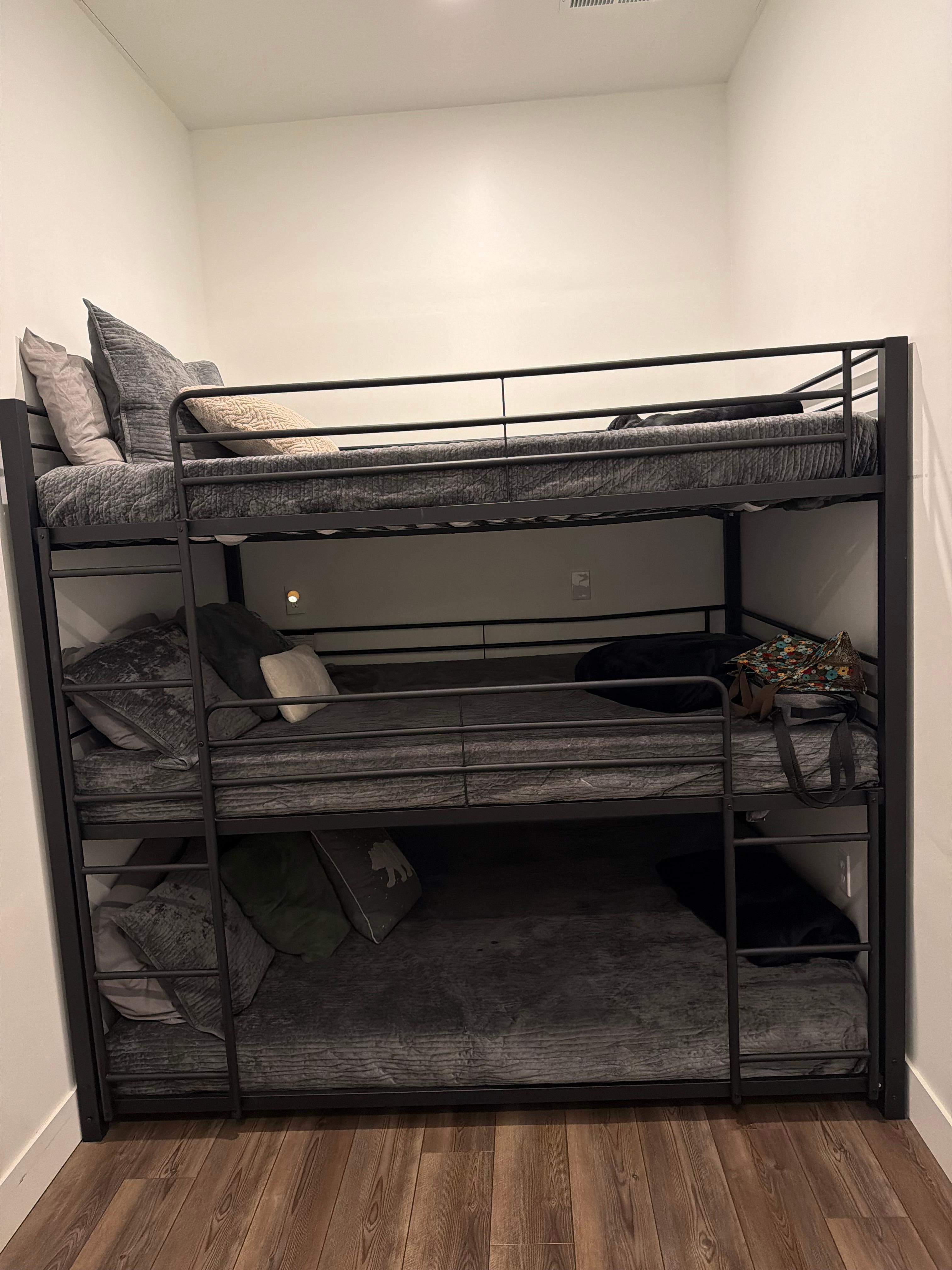 Inside, you'll find a modern, open-concept layout, featuring Starlink internet, 12-foot ceilings, a private king bedroom and a three-tier queen bunk room, perfect for the kids. The fully-stocked kitchen is equipped with open shelving, a farmhouse sink, stainless steel refrigerator with water and ice dispenser, and washer and dryer. Unwind in the spacious living room, complete with a sectional sofa and 65" 4K Smart RokuTV. Refresh in the private bathroom, featuring a walk-in shower.