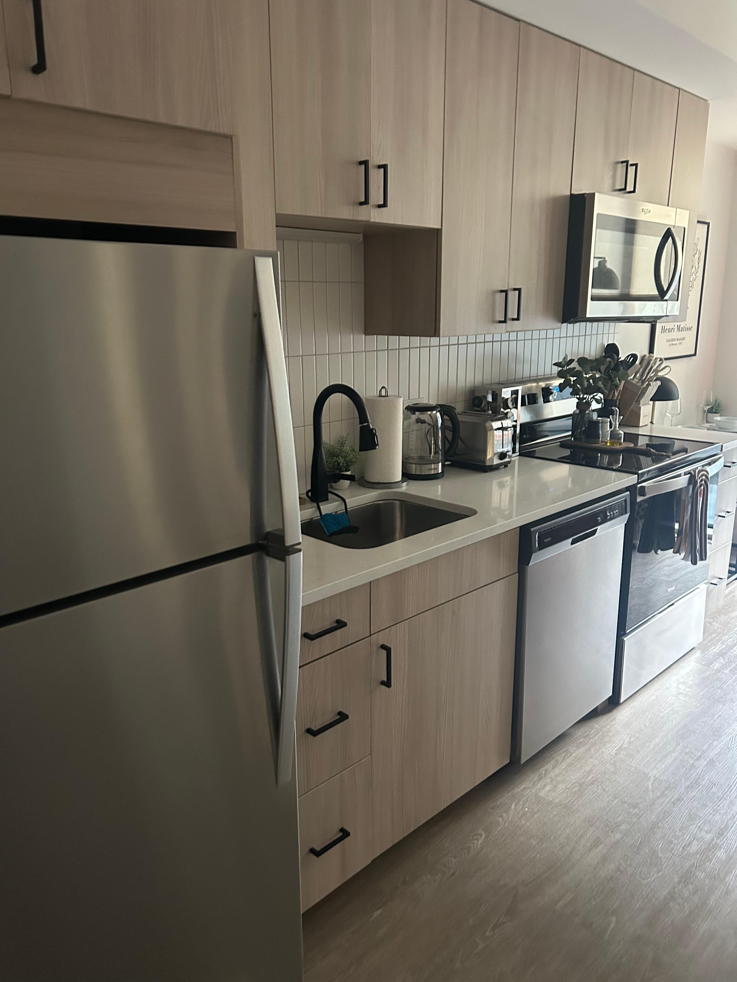 Enjoy a fully equipped kitchen with Keurig and frother, wine and cocktail glasses, pots, pans, toaster, rice maker, blender, full-size refrigerator, and more.