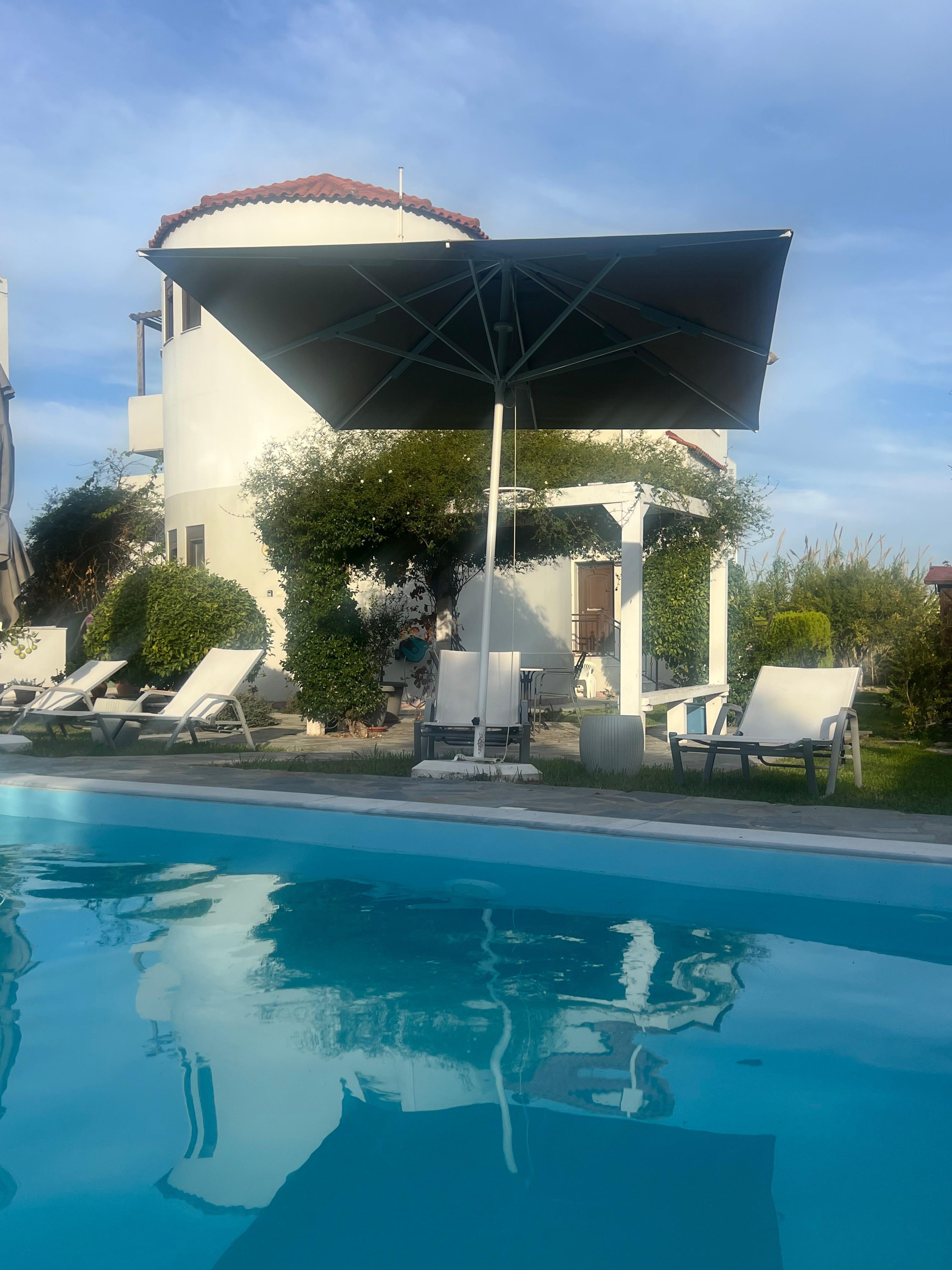 The property shares a large (1500m2) garden of citrus fruit, herbs, roses, boucanvileas and flowers along with a large pool with sunbeds and space to relax.