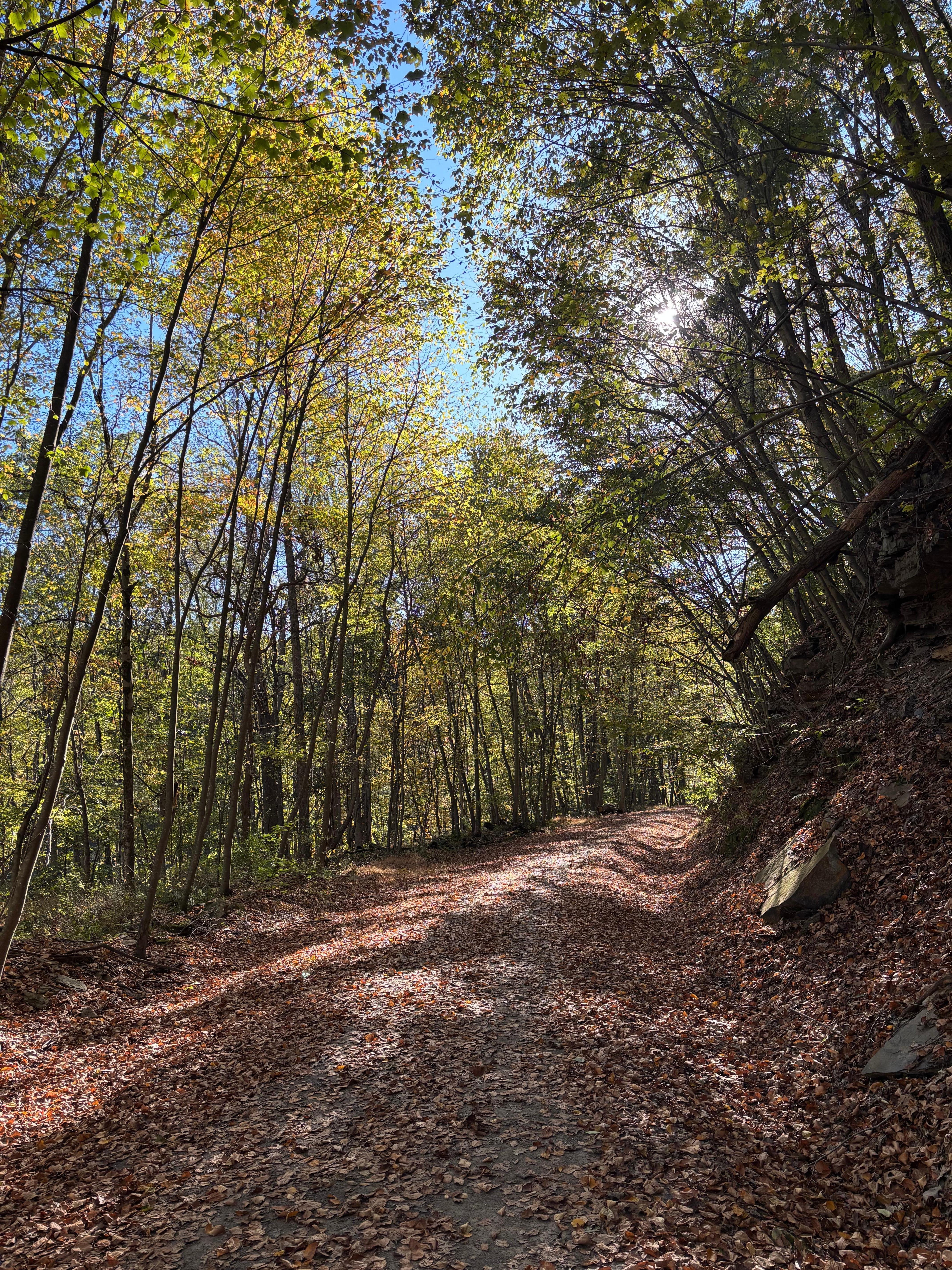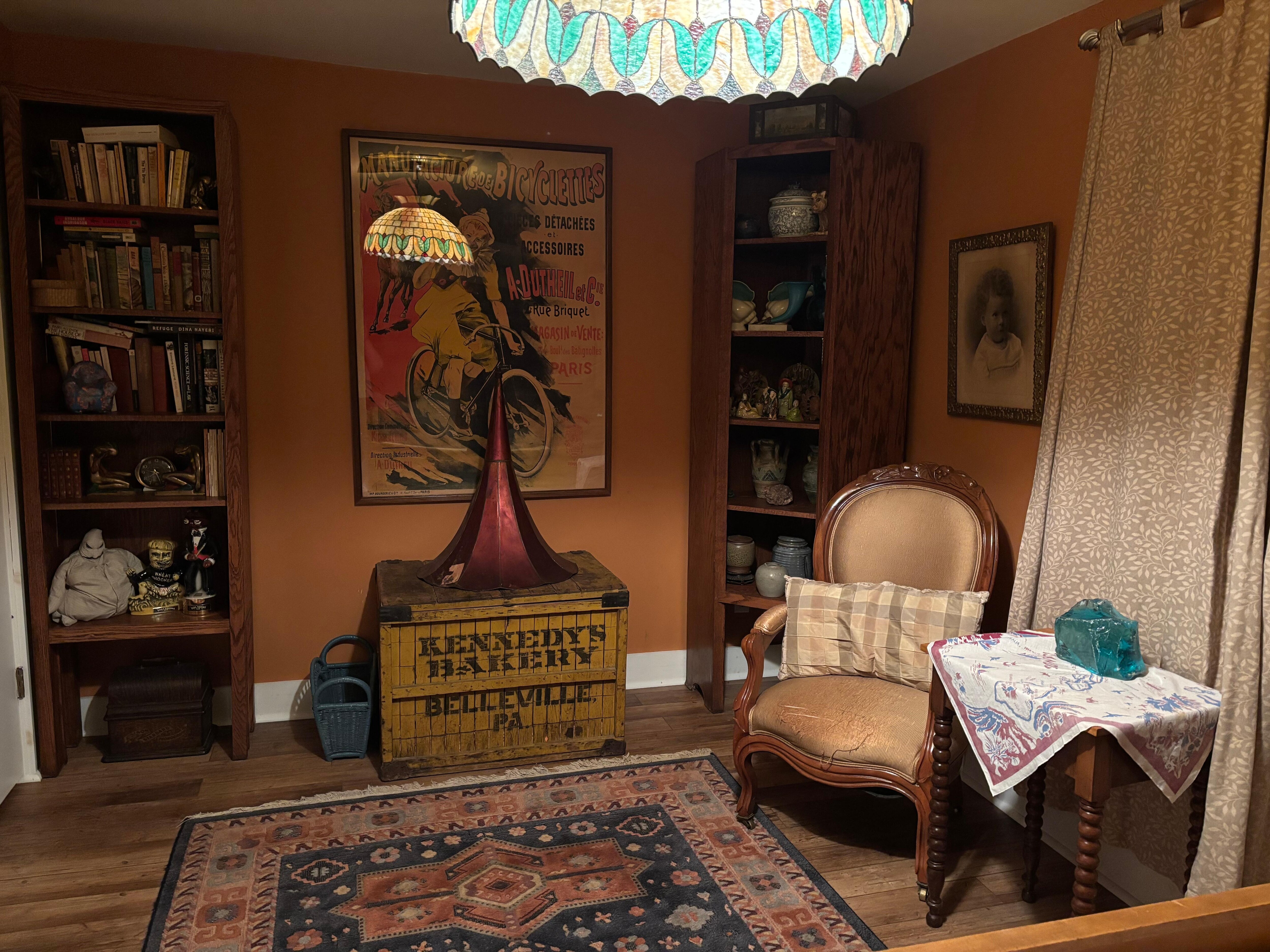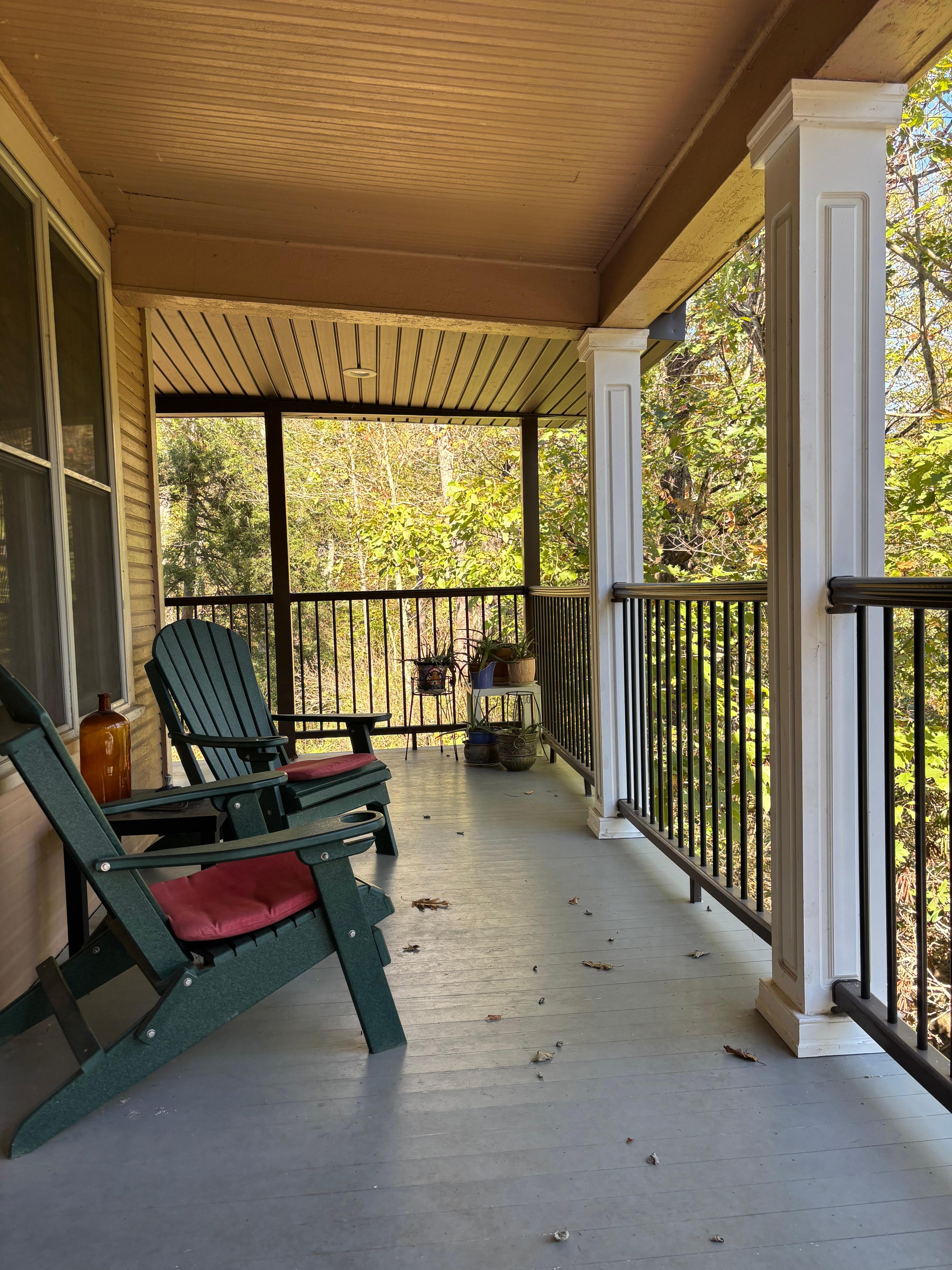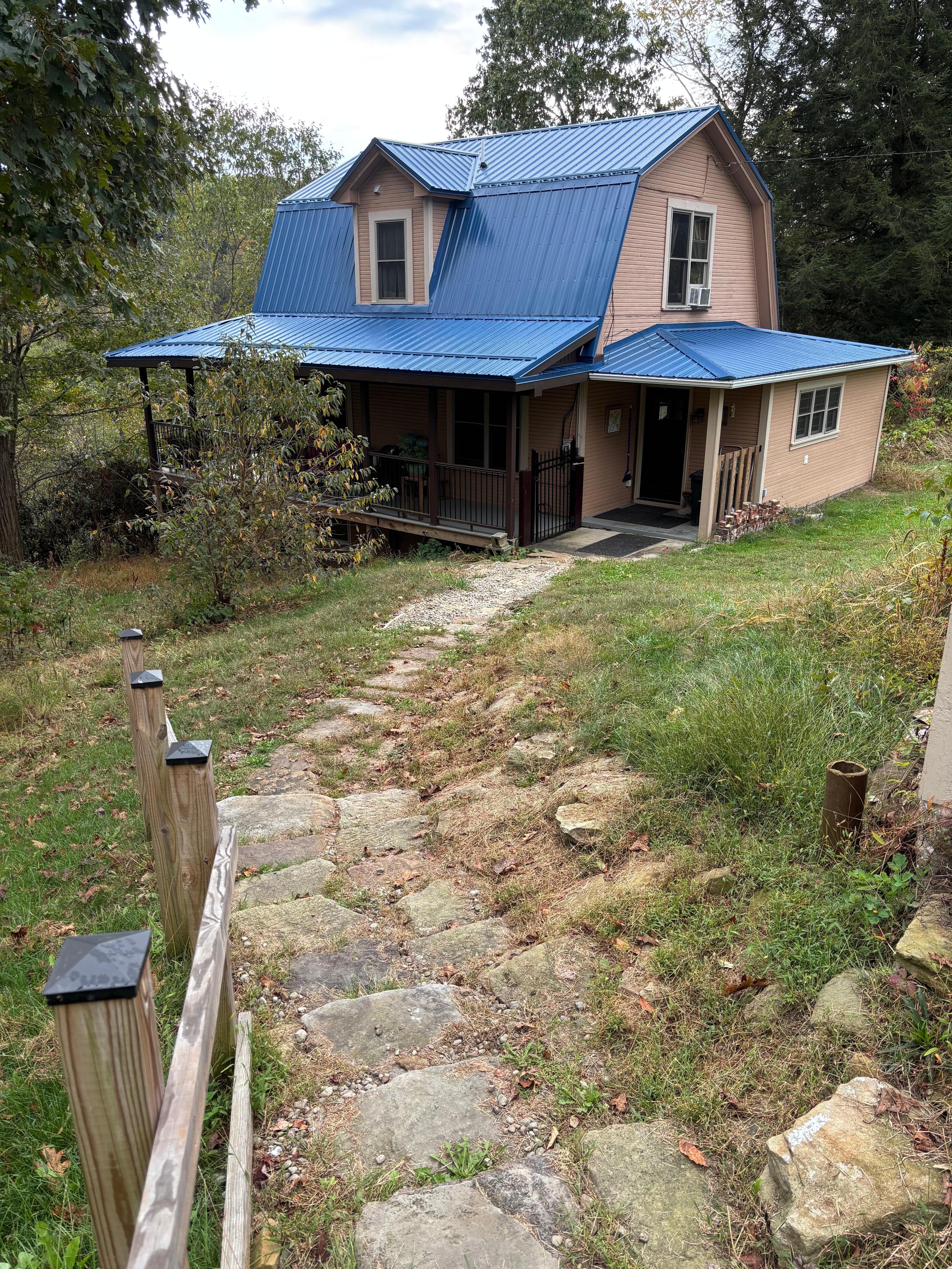 Hillside Home is an early 20th century home on the hillside above the village of Lawsonham in southern Clarion County. The home sits in a shaded wooded setting. It faces eastward with a scenic view of the village and valley of the Redbank Creek. (Sunrises here are often spectacular!) The Redbank Valley Rail Trail (redbankvalleytrails.org) passes in front of the house at the bottom of the hill, accessible by a short drive to the trail’s parking area. The house sits on a quiet private lane with hard road passing at a downhill below the house. There is a spacious elevated front porch facing the valley. We recently extended the porch along the north side of the house, so there’s plenty of space to sit and relax outside in good weather.