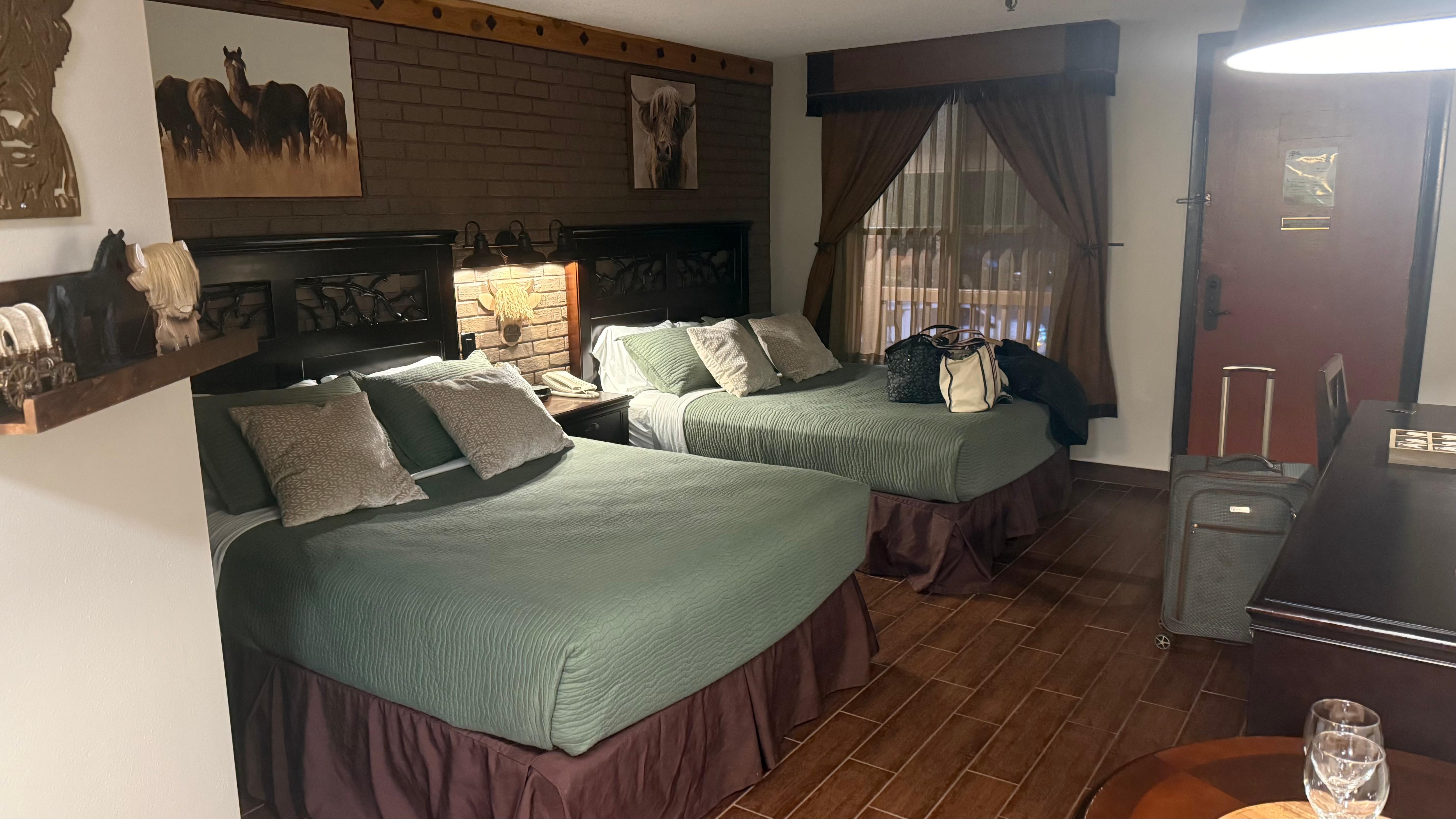 •The room features two comfortable queen beds, perfect for a restful stay whether you ’re here for a weekend escape or a longer adventure. You’ll also find a full bathroom with a bathtub and hair dryer for your convenience.