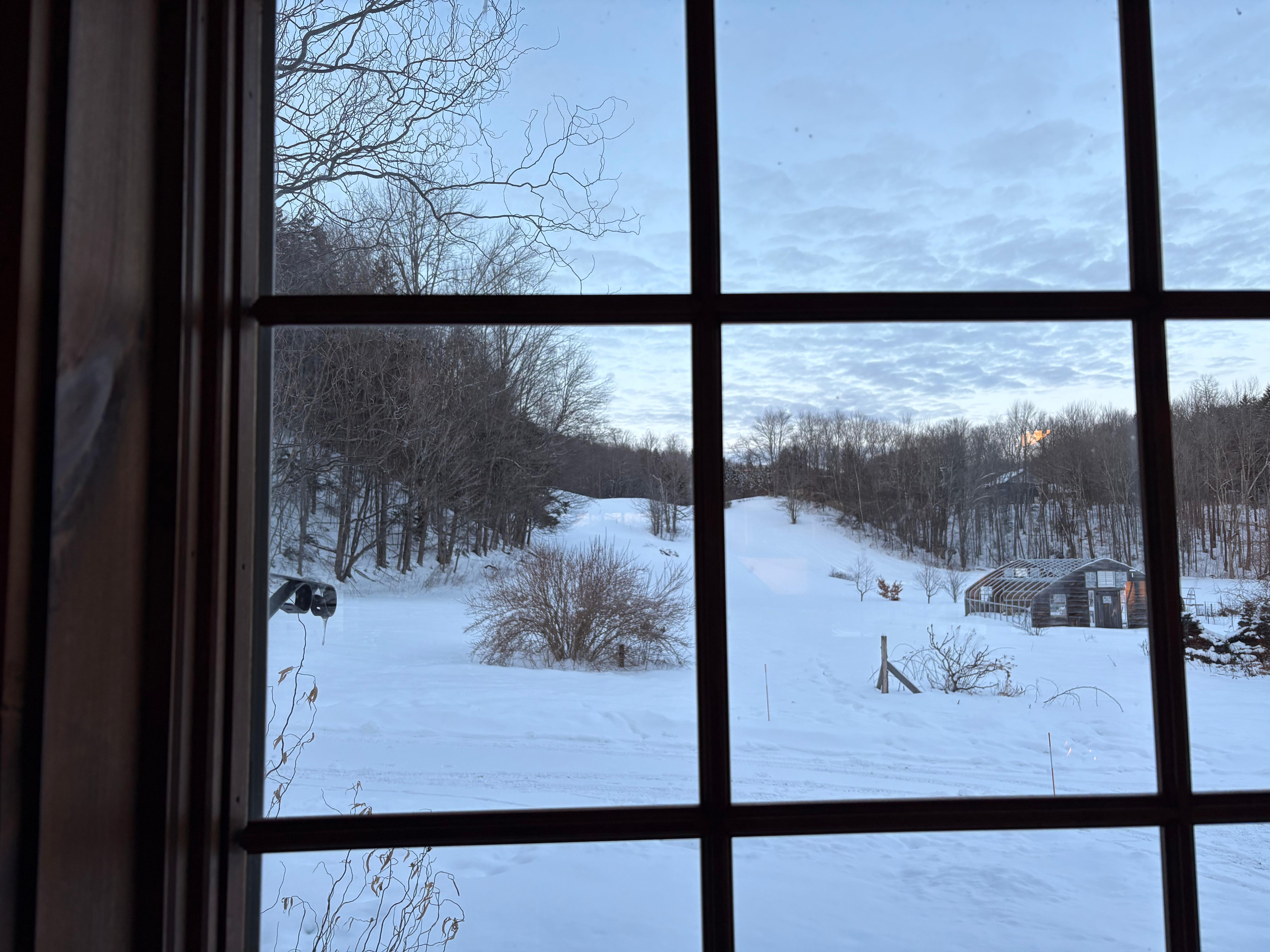 Outside, numerous sustainability measures are helping to reduce the footprint of the farm. Two large solar arrays offset the electricity usage of all five buildings. A large greenhouse extends the growing season and allows us to offer local produce and flowers for sale. Our flock of chickens consumes much of our food scraps and provides sustainable fertilizer for the gardens, as well as year-round eggs. And our free range children keep life exciting and will be enthusiastic about showing you their latest snow forts, mountain bike trails, sledding runs or dams in the stream. Coming next: lambs and Indian runner ducks!