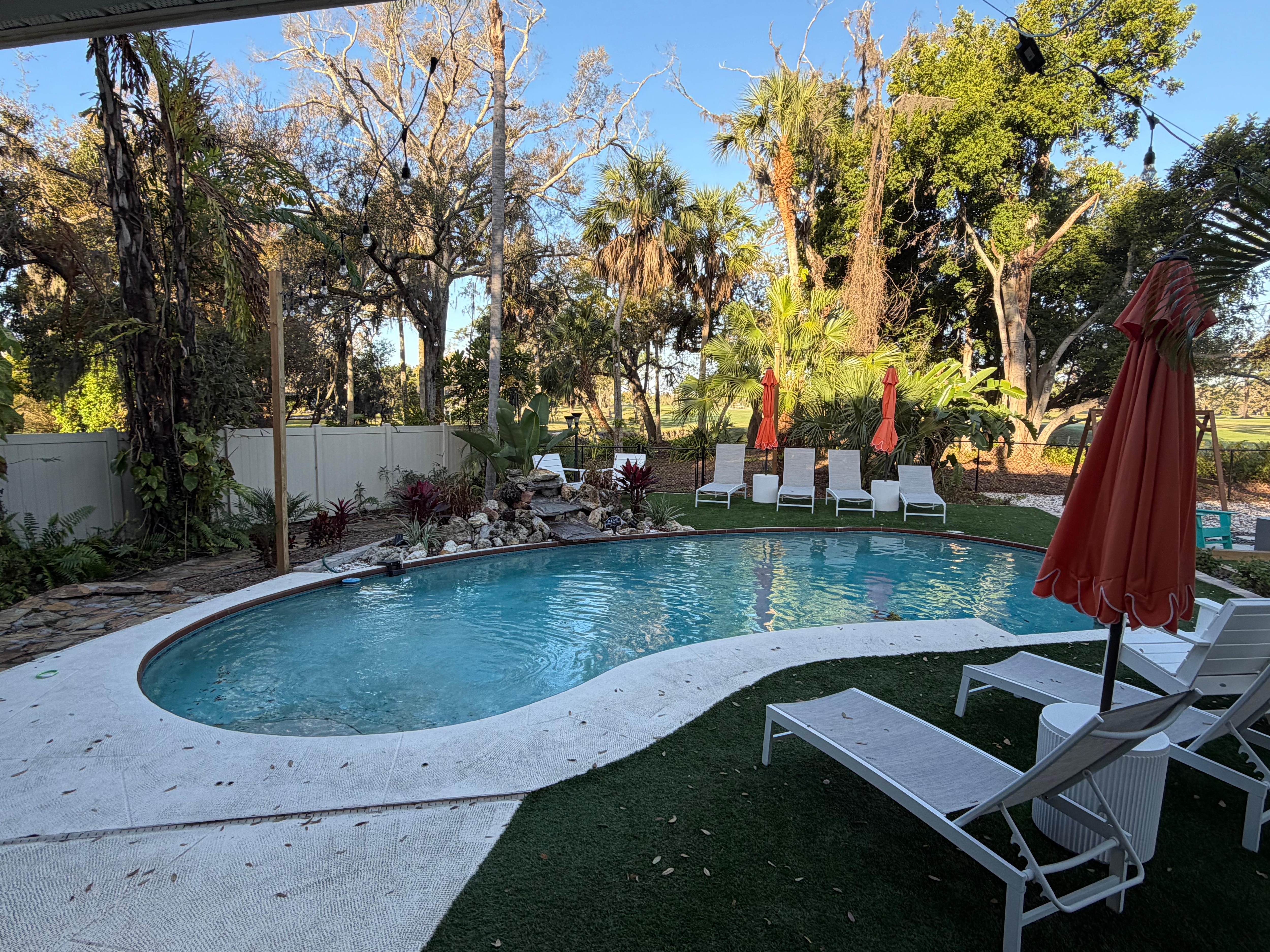 🦩Tropical oasis area & heated pool - includes pool loungers, Polywood lounge chairs, cabana tables + umbrellas, pool fountain, towel drying rack, & lush tropical landscaping