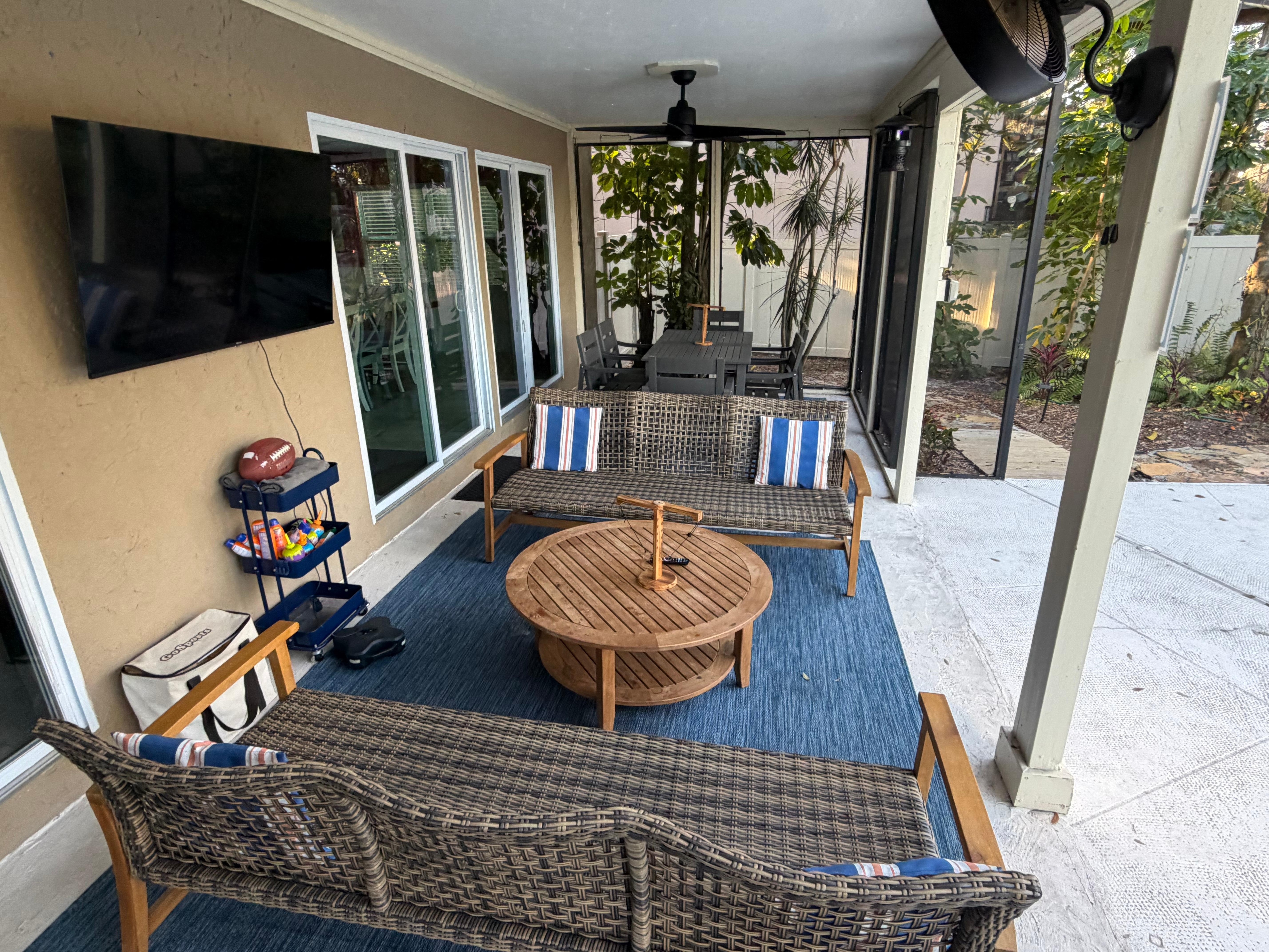 🦩Pool lanai outdoor living area - includes smart TV, outdoor living set, outdoor dining set, fun smart curtain/wall lighting, various fans, & tons of outdoor + pool accessories