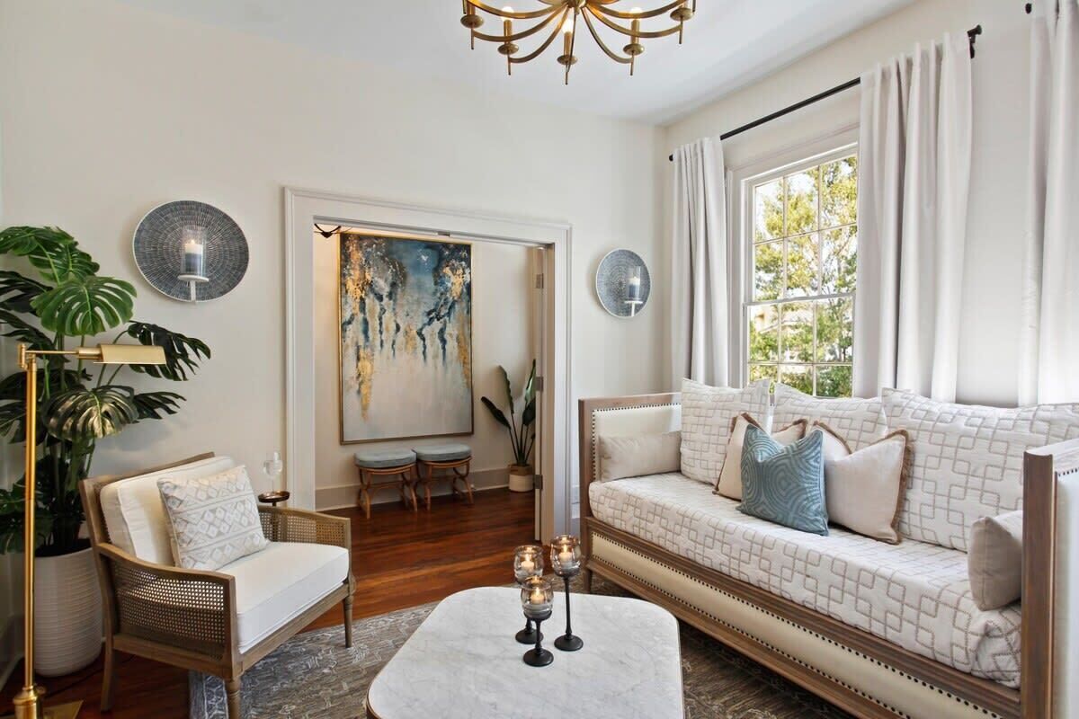 Perched on the second floor, this chic 3-bedroom, 2-bath sanctuary blends historic charm with elegant modern décor. Original hardwood floors, high ceilings, and classic molding provide an inviting atmosphere. Cook in the fully equipped kitchen, unwind on the shaded porch with treetop views, and enjoy peaceful privacy with no shared walls. Premium linens, beautiful bathrooms, and full laundry amenities complete the experience.