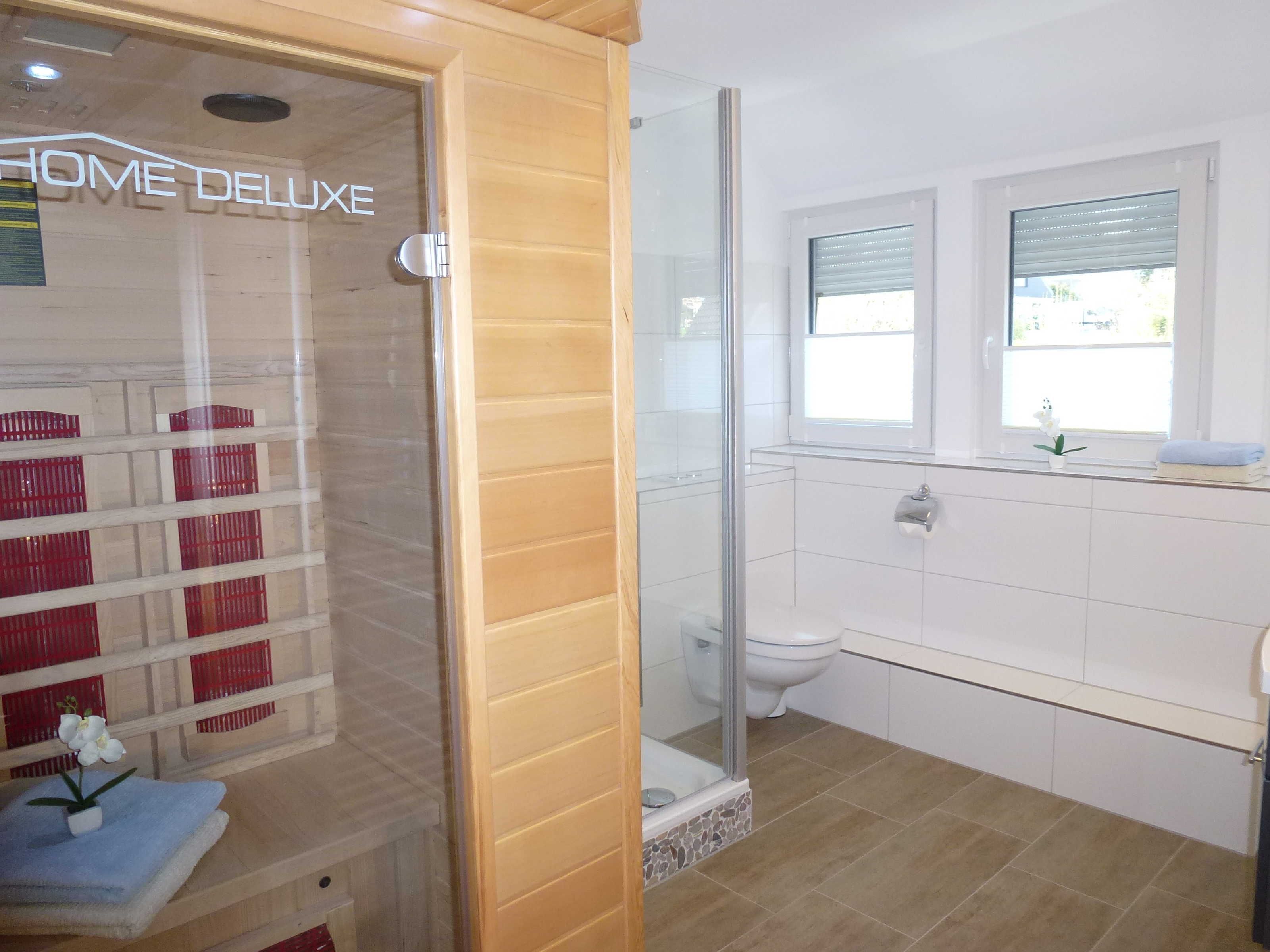 The apartment 5 is located on the mezzanine, has about 50 m² and offers a beautiful view of our garden and the adjacent spa park. In the modern living room you will find a sofa bed (leather, 1.40 mx 1.90 m), a 32-inch flat-screen TV (cable) and a dining area for 2-4 people. For cozy evenings we have also provided books, DVDs and games for all ages. In the bedroom are two single beds each 0.90 m x 2.00 m and a mini hi-fi system. The separate, fully equipped kitchen has an oven, microwave and dishwasher as well as a Senseo coffee machine and a freezer in the fridge. In the entire apartment are fly screens on the windows, in the living rooms and bedrooms and external blinds. That families feel comfortable in our guest house is very important to us. Therefore, we are happy to provide travel cot, high chair and baby bath. Our large garden with sunbathing area, terrace, trampoline and small sandbox invites you to relax, play, clink, table tennis or barbecue. A parking space is available free of charge on our property. For bicycles we have a shelter. By the way: The nearest supermarket is just 5 minutes on foot.