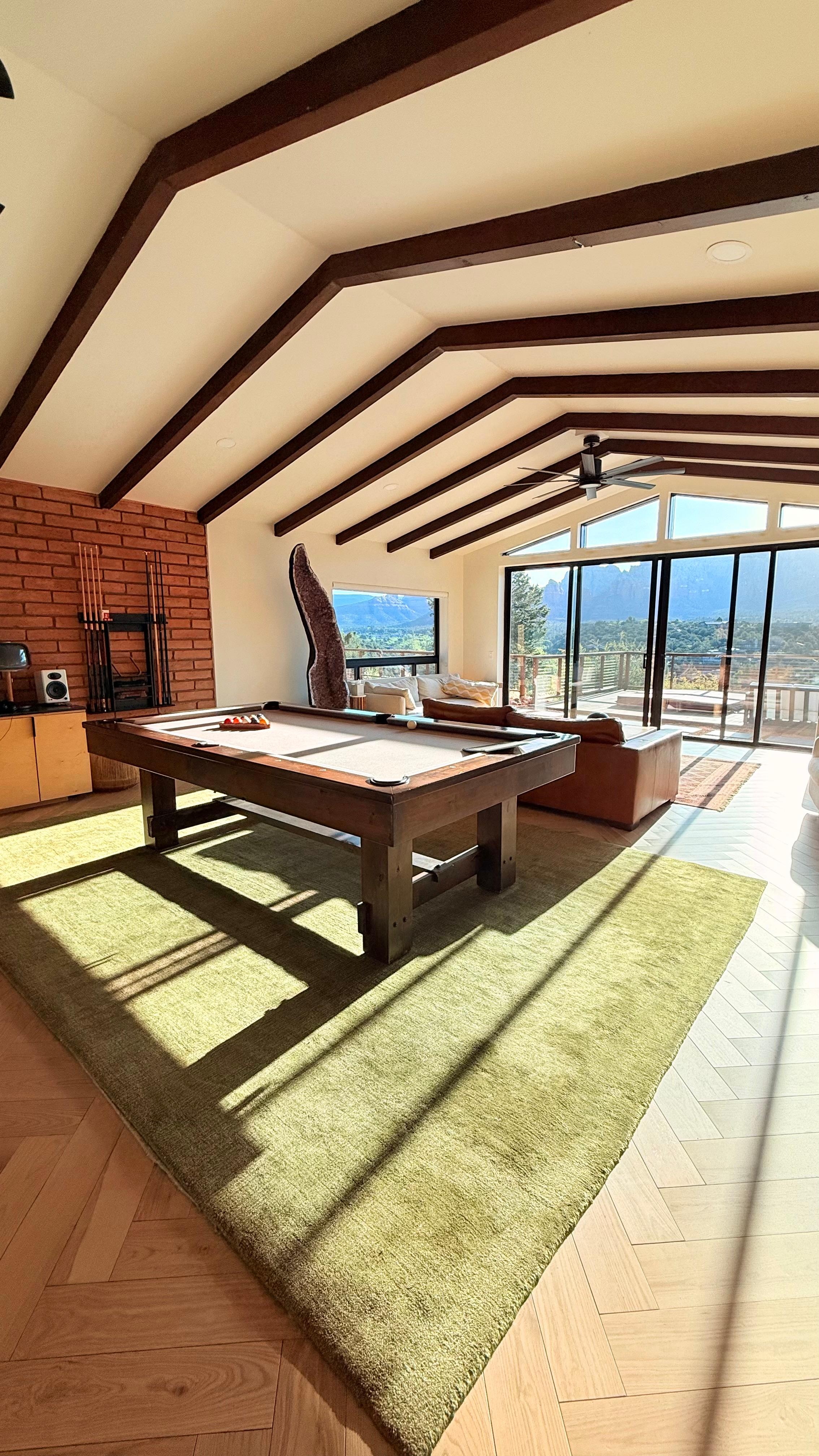 The expansive living areas boast floor-to-ceiling windows, a pool table, and a 75` Smart TV, making it the perfect place to relax and unwind.