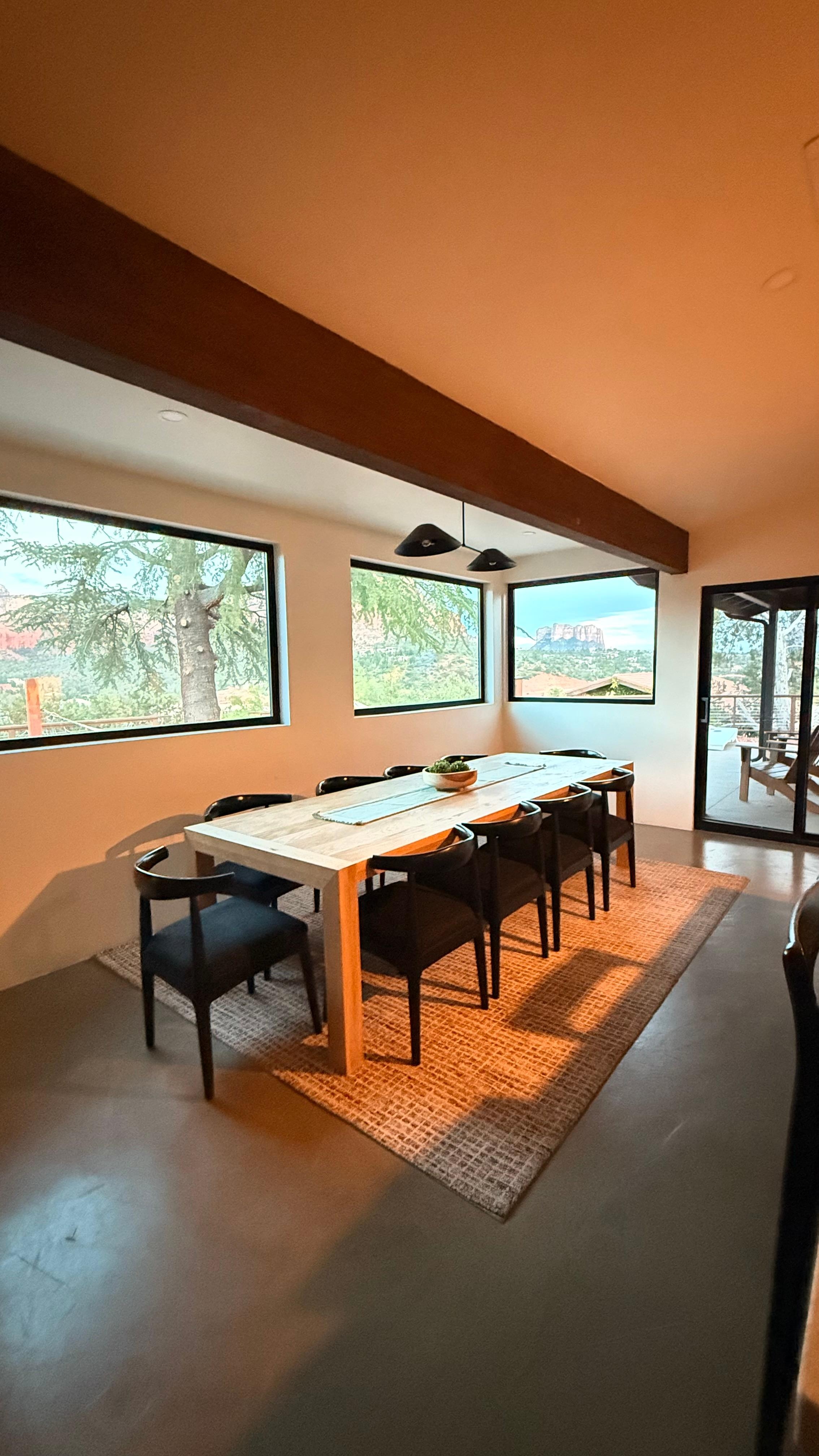 Step outside to a massive patio featuring a 400 sq. ft. cantilevered deck, where you`ll be surrounded by breathtaking, unobstructed views of Mammoth Rock, Courthouse Butte, Bell Rock, Schnebly Hill, and the stunning Sedona landscape. Designed for both relaxation and entertainment, this outdoor oasis includes a 6-person saltwater hot tub, perfect for soaking under the stars, two hammocks for unwinding amidst nature, a fire pit for cozy evenings, and a spacious dining area ideal for enjoying meals with a view. Whether you`re sipping coffee at sunrise or toasting to a spectacular Sedona sunset, this space offers an unforgettable experience.