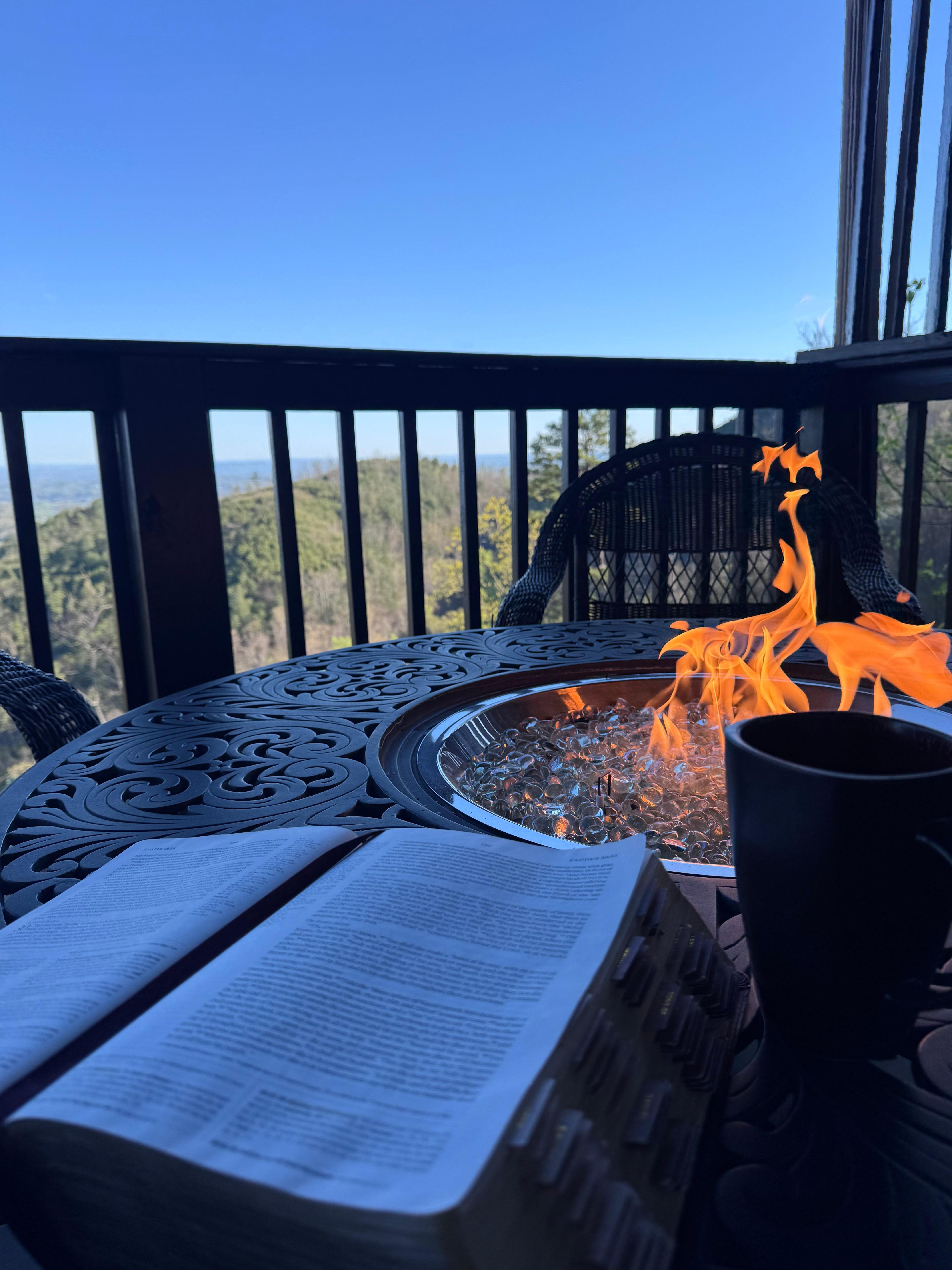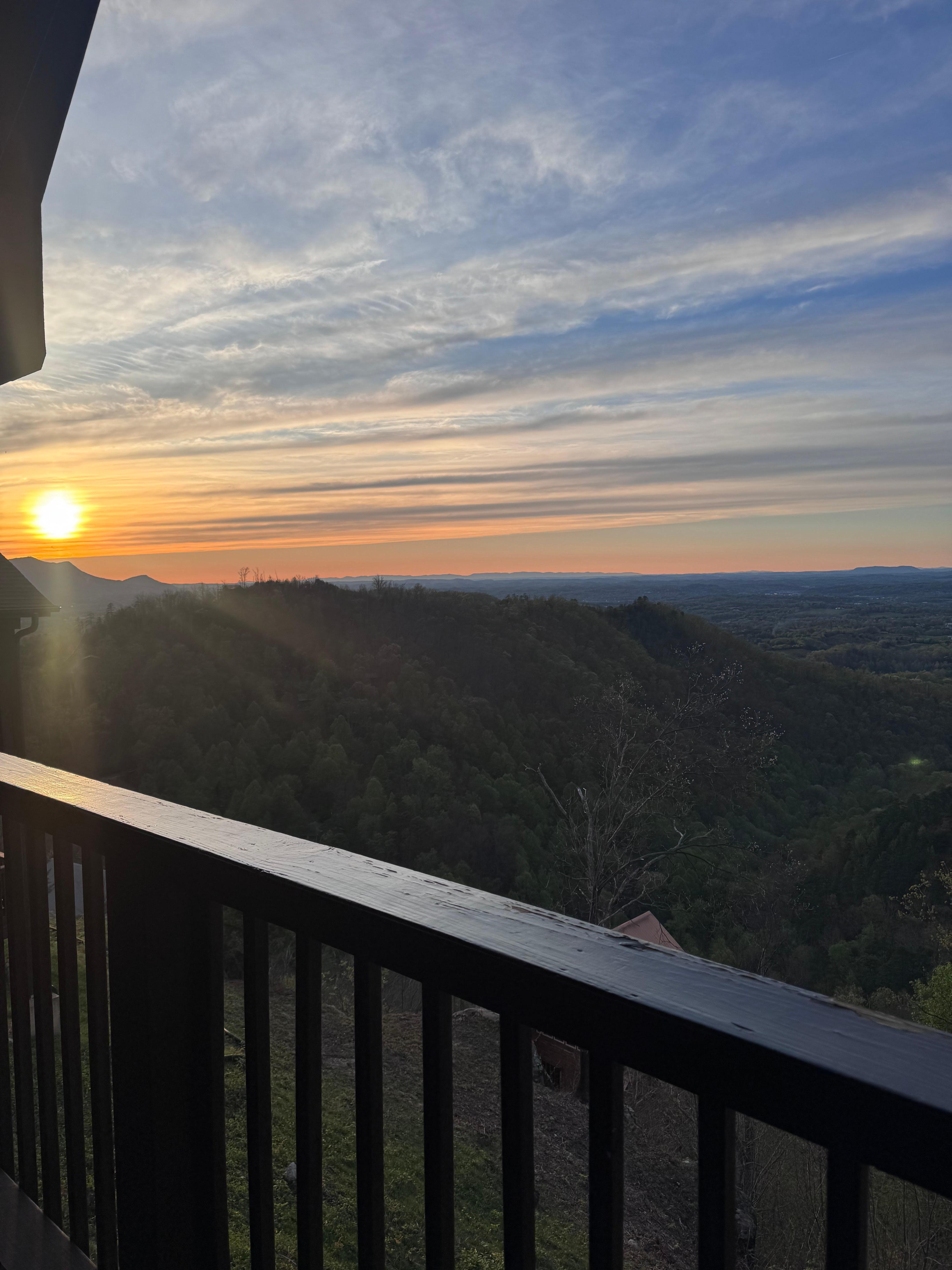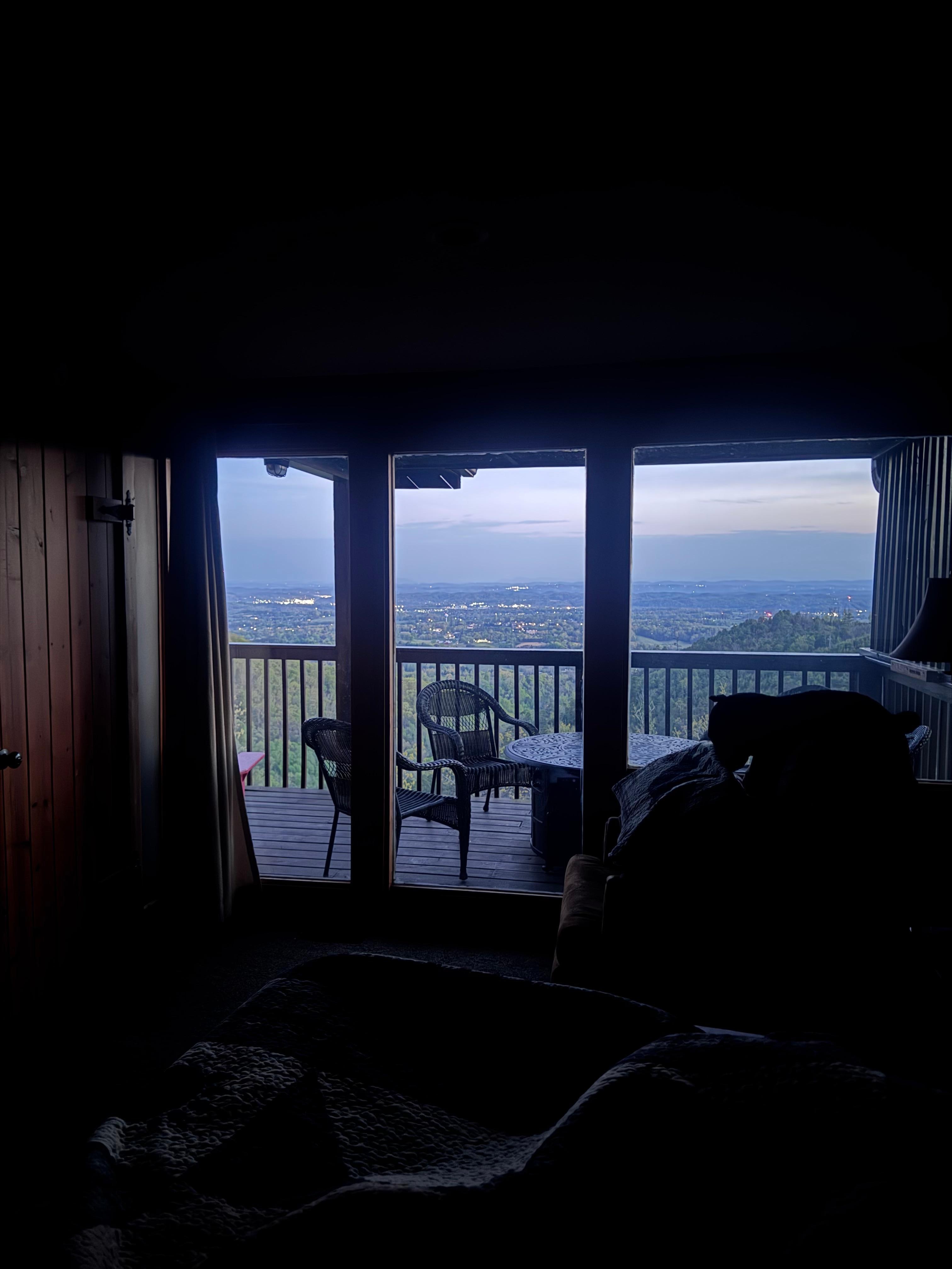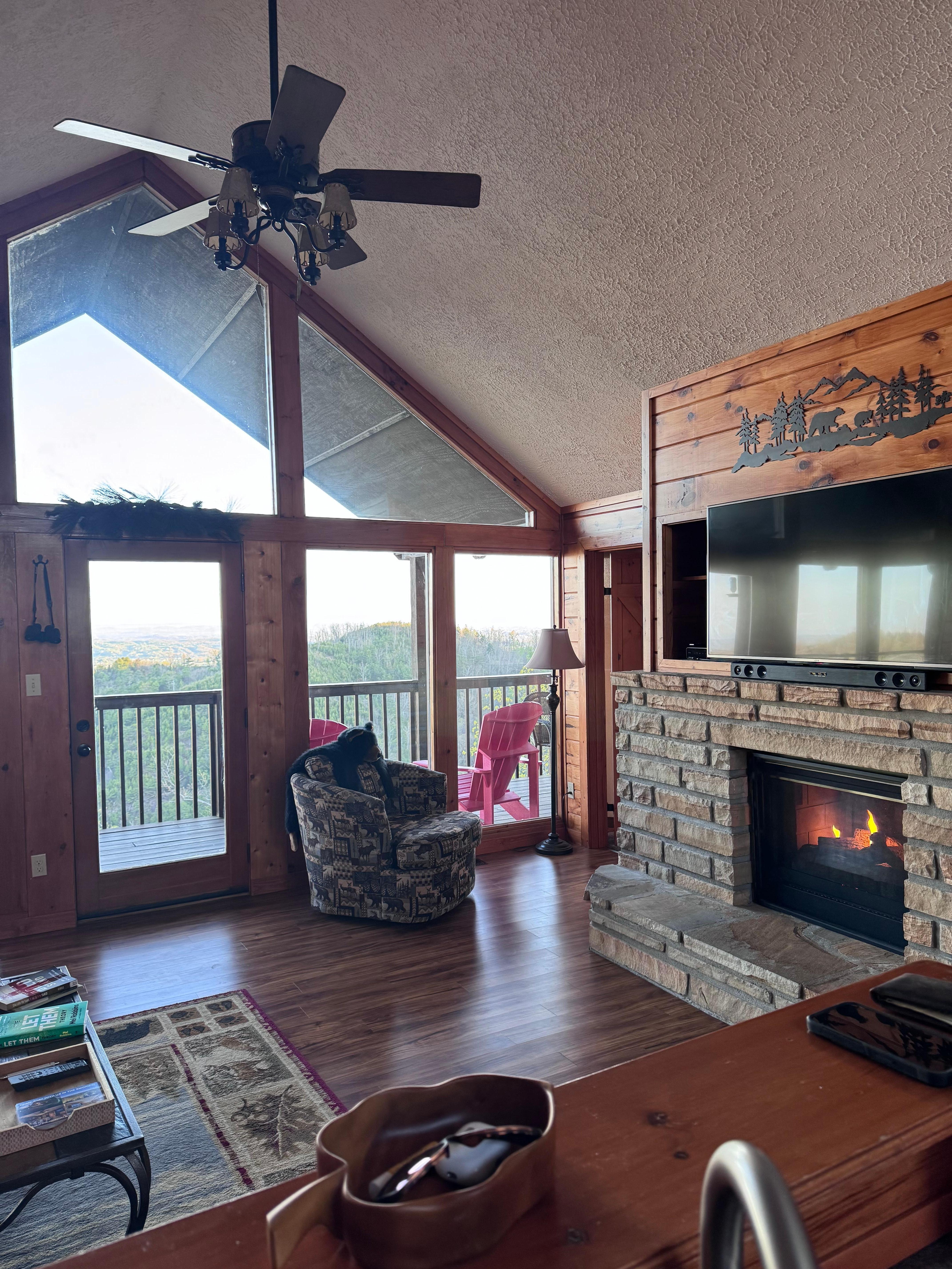 While the inside of the cabin is a wonderful place to relax- the back deck is even better! Of course, there is that amazing view with plenty of seating to just sit and do nothing. There is a brand new hot tub on one end of the deck and a gas fire pit with four chairs on the other end. (There are also skewers hanging on the wall for toasting marshmallows!) Enjoy views of downtown Sevierville and Pigeon Forge. At night, you can see the LED Ferris Wheel at The Islands. On clear days, you can see over 60 miles and the Jellico Mountains at the Kentucky/Tennessee boarder is in view. Sit on the deck and enjoy the sunset over Bluff Mountain to your left. During the summer you can see the fireworks from Dollywood to your left.