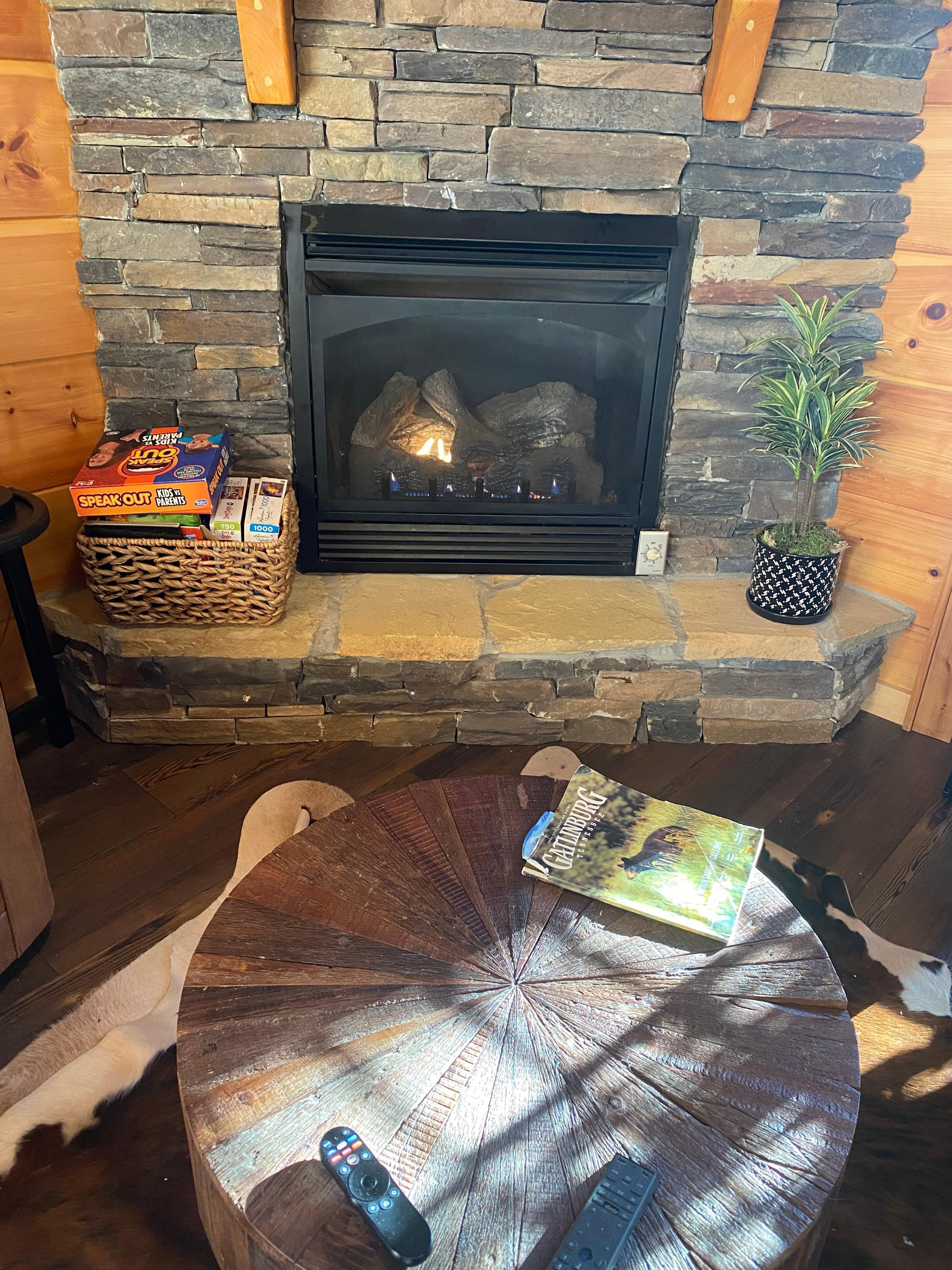 🛋️ Living room with stone gas fireplace, large Smart TV and a sofa sleeper