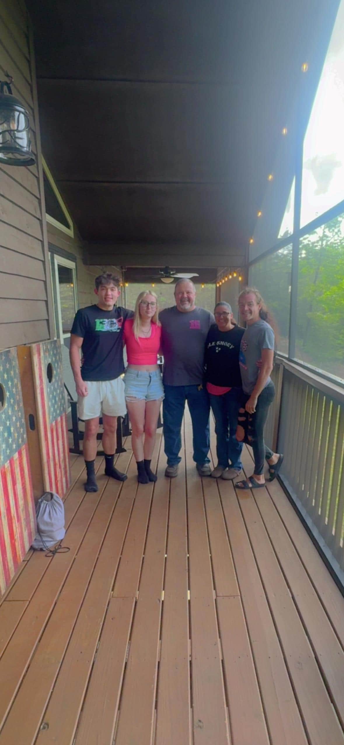 * String lights in screened porches and carport create magical evenings