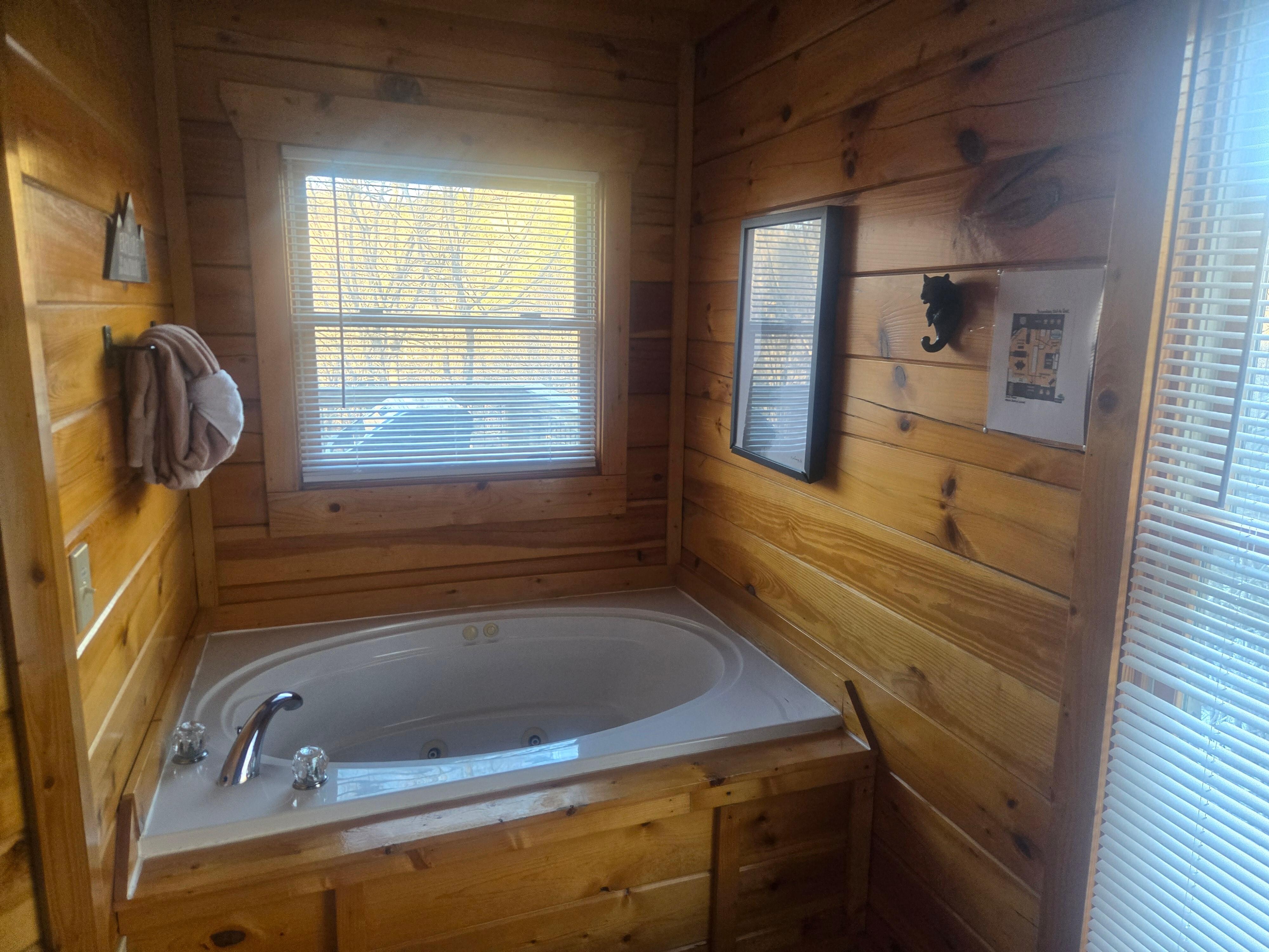 "A Bear Endeavor" is a spacious 3-level cabin. The main level consists of a King suite with jetted tub and vaulted ceilings in the living room and kitchen. This level also has a deck with an eating area and a new grill. The second level is another King Suite and laundry closet at the top of the stairs. The basement includes a half bath, game room, and an updated theater room. There are sleeper sofas in the Game Room and the Theater Room. There's another deck on this level with an eating area and hot tub.