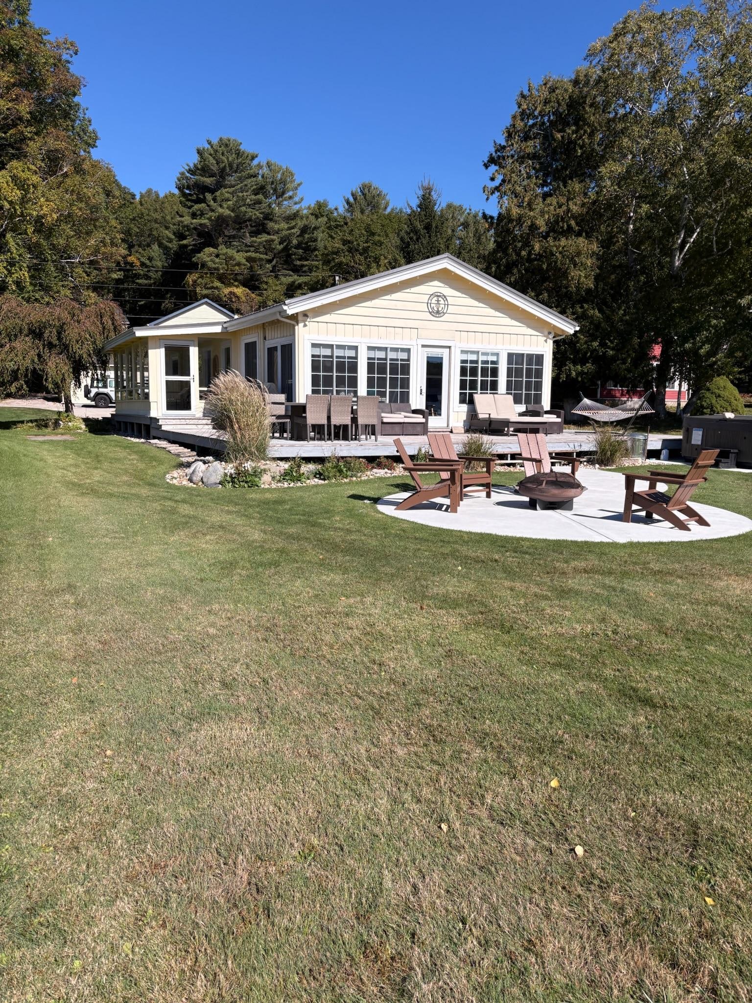 Outside, the lake is your playground: bring your own boat to enjoy from the private dock, paddle with the provided kayaks, or unwind by the firepit on crisp evenings. In the fall, watch the shoreline glow with vibrant leaves, explore nearby orchards, and enjoy cozy evenings by the fire. In the winter, soak in the hot tub surrounded by a blanket of snow, try ice fishing, or explore local trails for skiing and snowshoeing. Fast, reliable WiFi keeps you connected — only if you want to be.