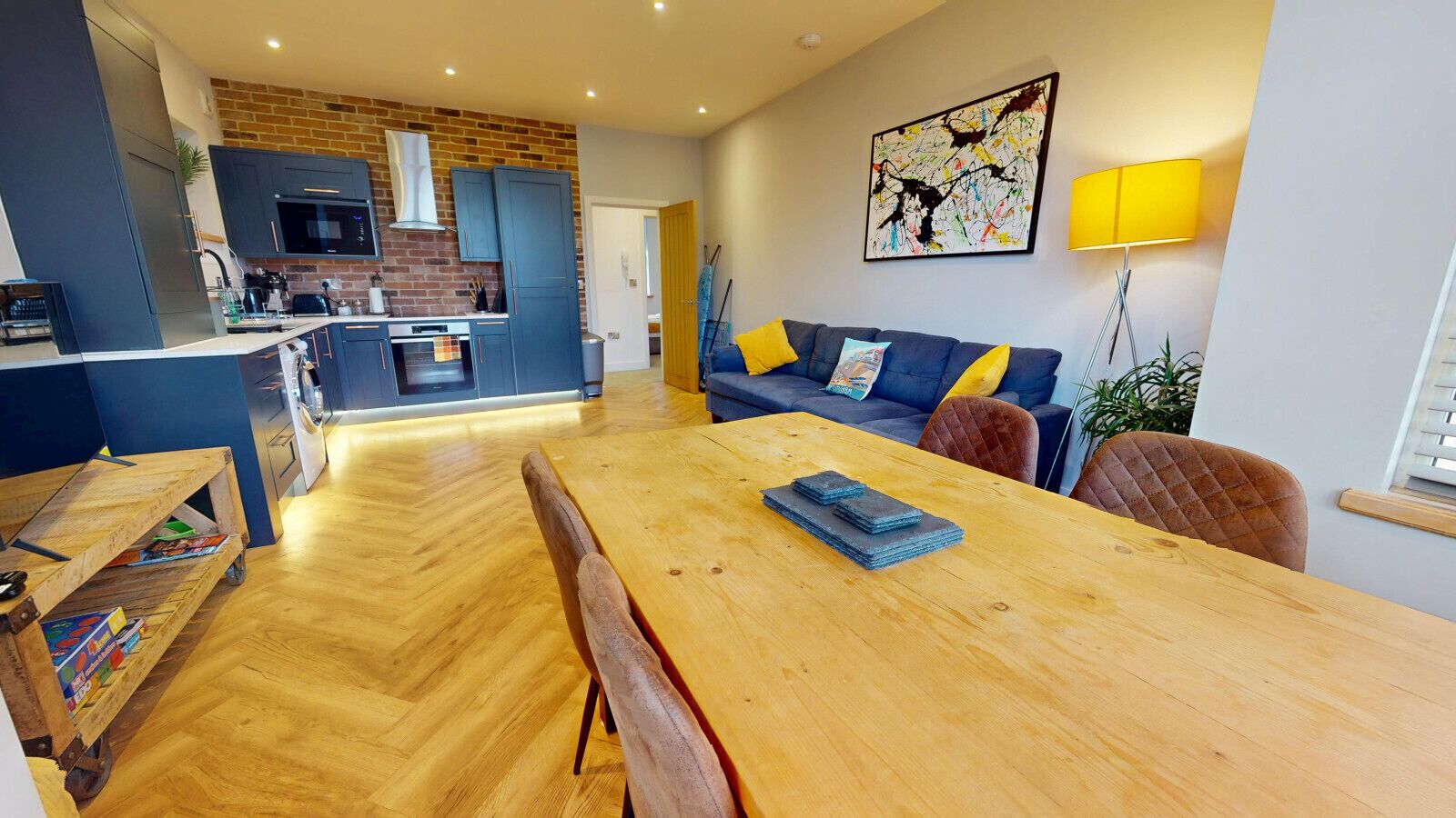 This room is open plan with the galley style kitchen equipped with everything the holiday chef could need including a dishwasher, oven, hob, and microwave.