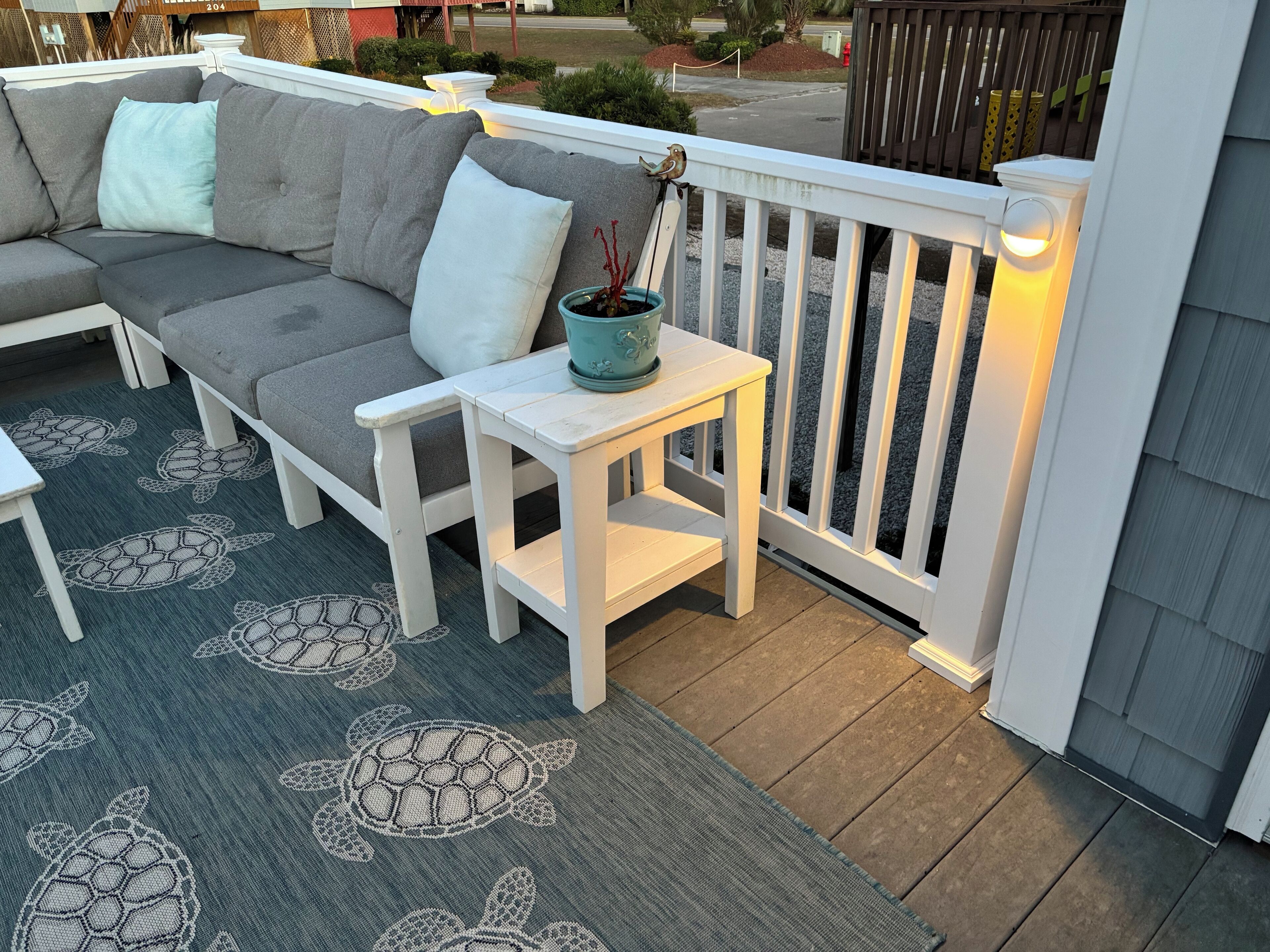 Front Sun Deck: Astroturf rug, outdoor seating and cocktail table, private entrance to living room.