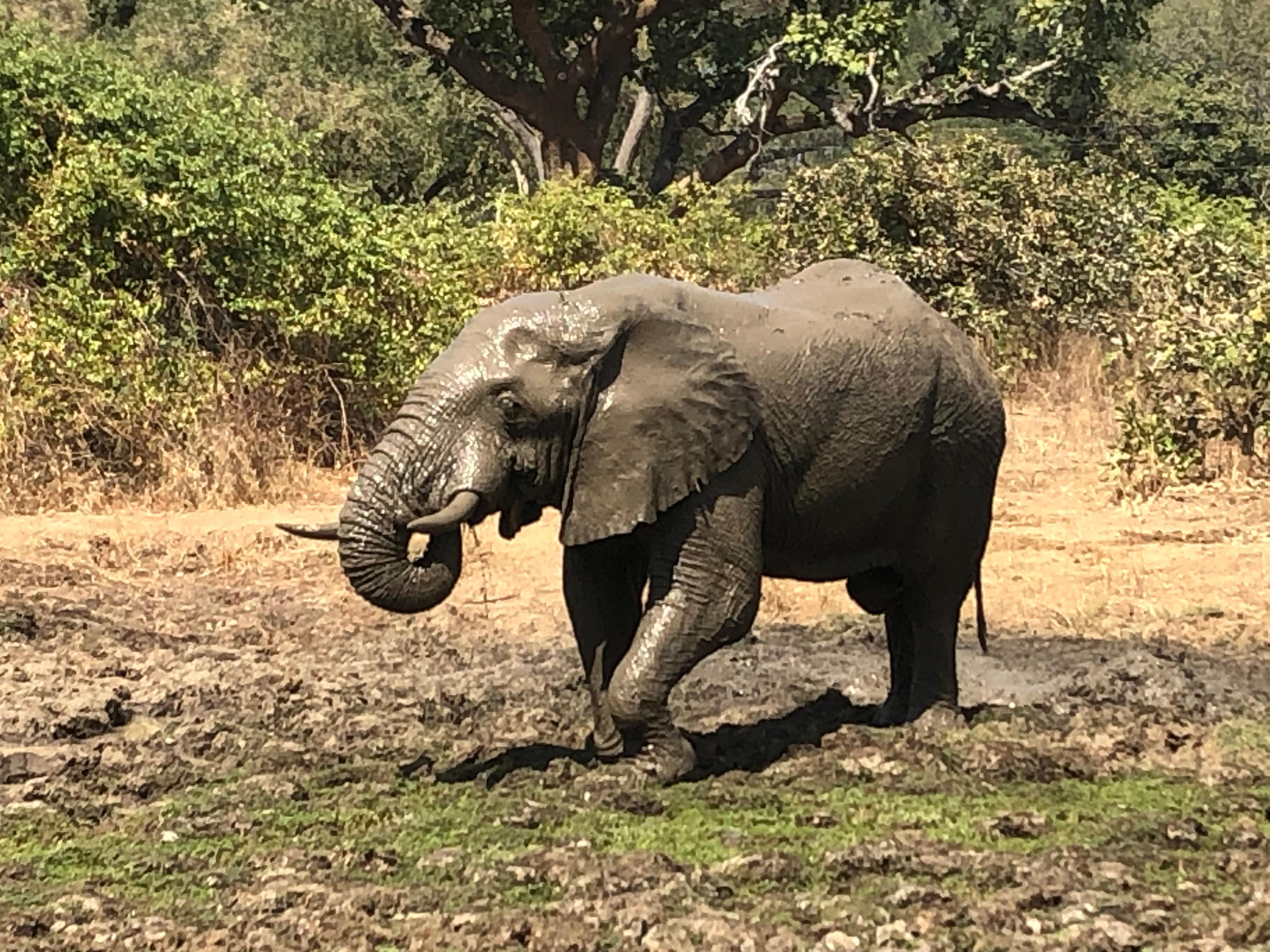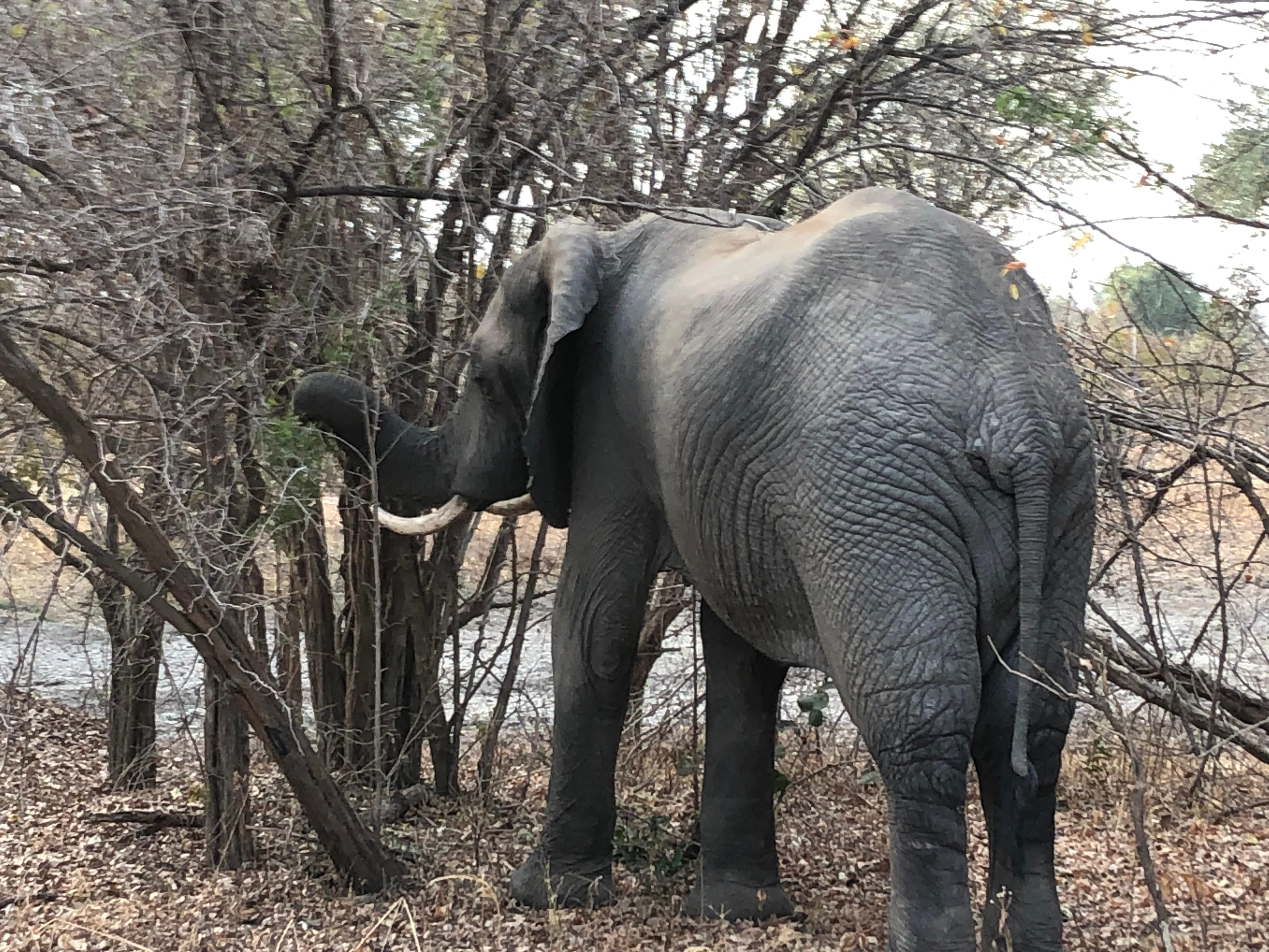 Right in front of our tent, at the dry waterhole, stood a huge elephant, peaceful and majestic – an unforgettable moment.