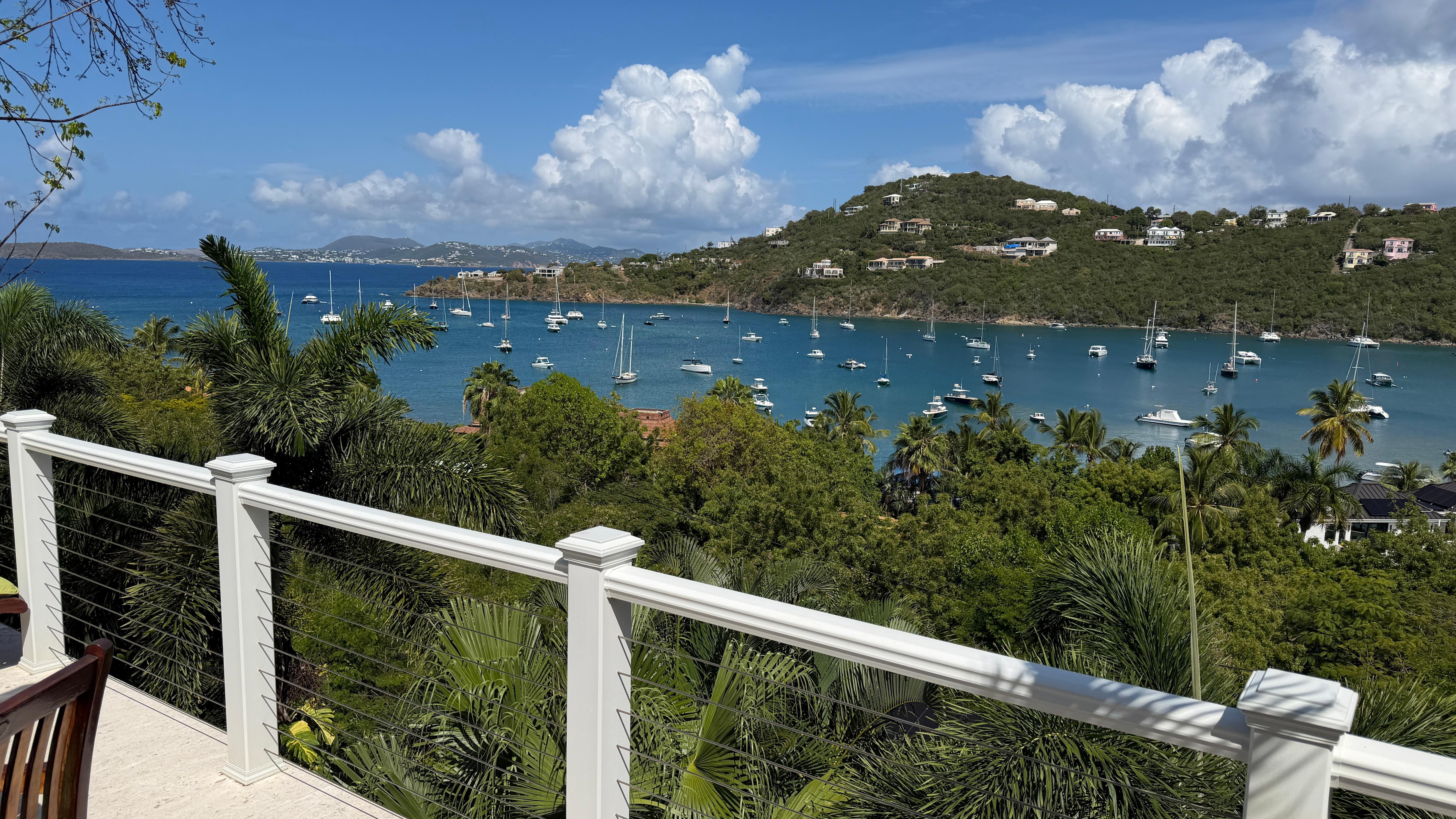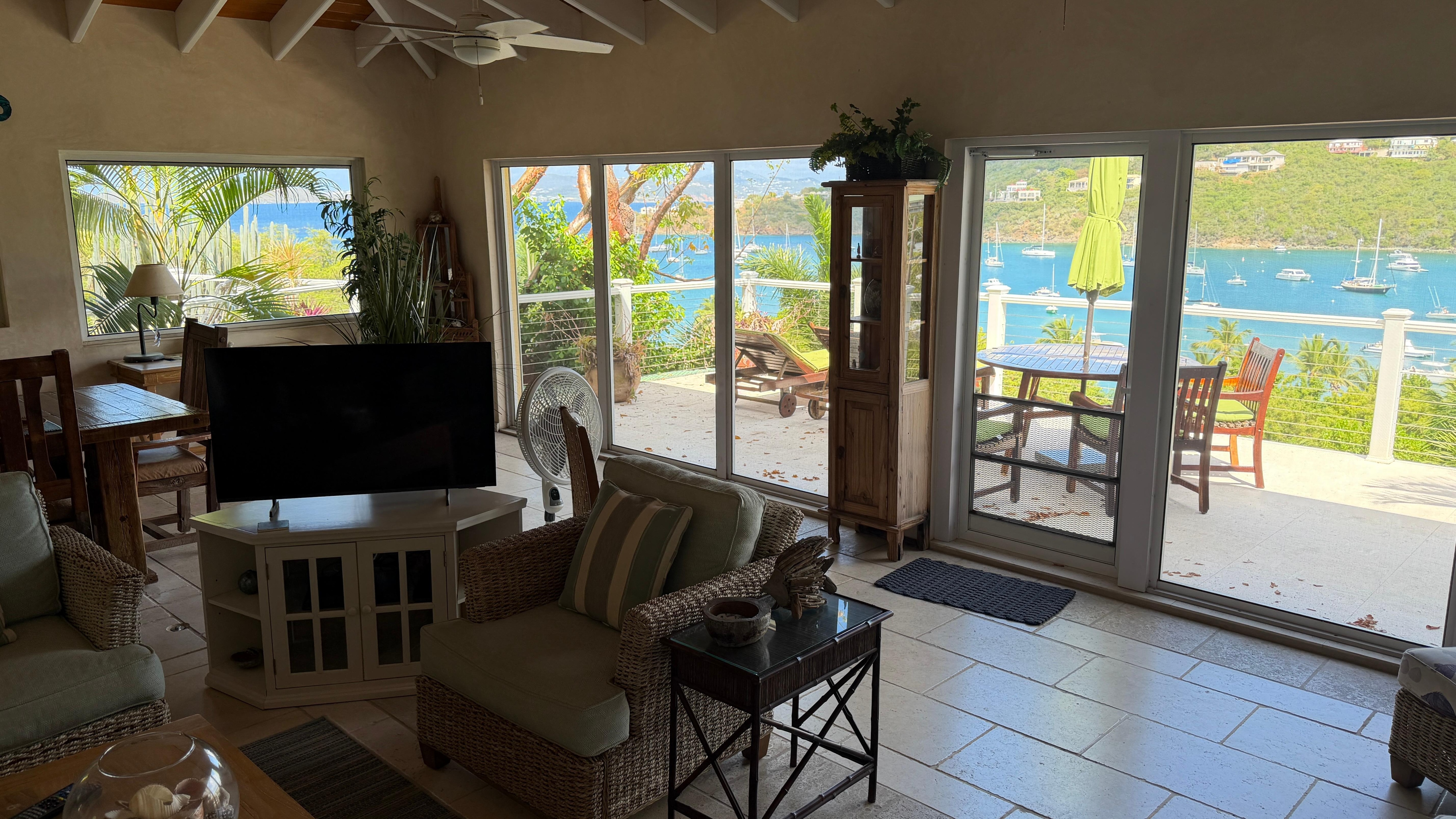 Chez Shell also has multiple living spaces inside and out so you may enjoy the active harbor views and sunset views towards St Thomas from many different areas.