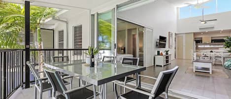 Large entertainer’s balcony with alfresco dining, Weber BBQ, and serene river glimpses