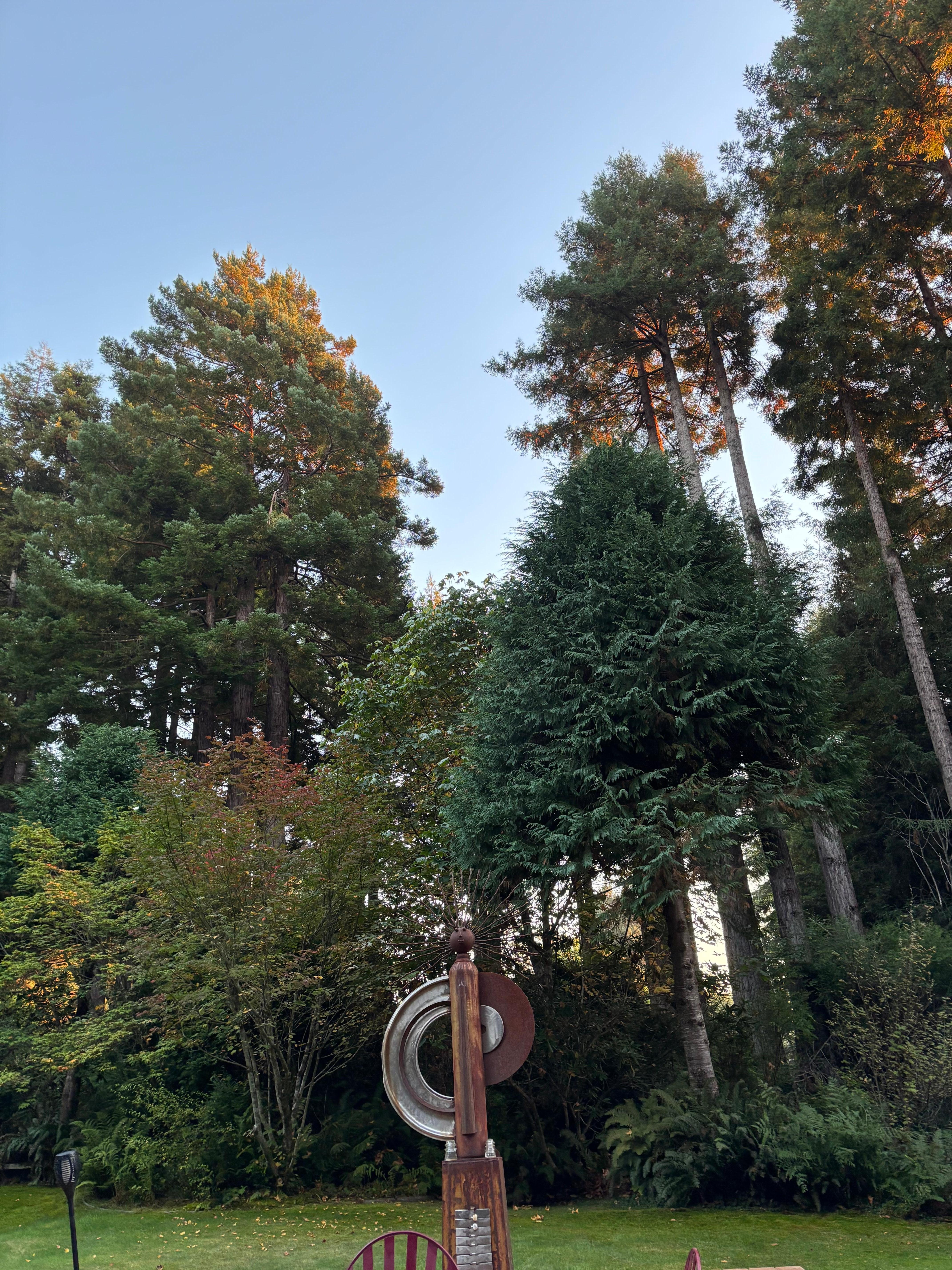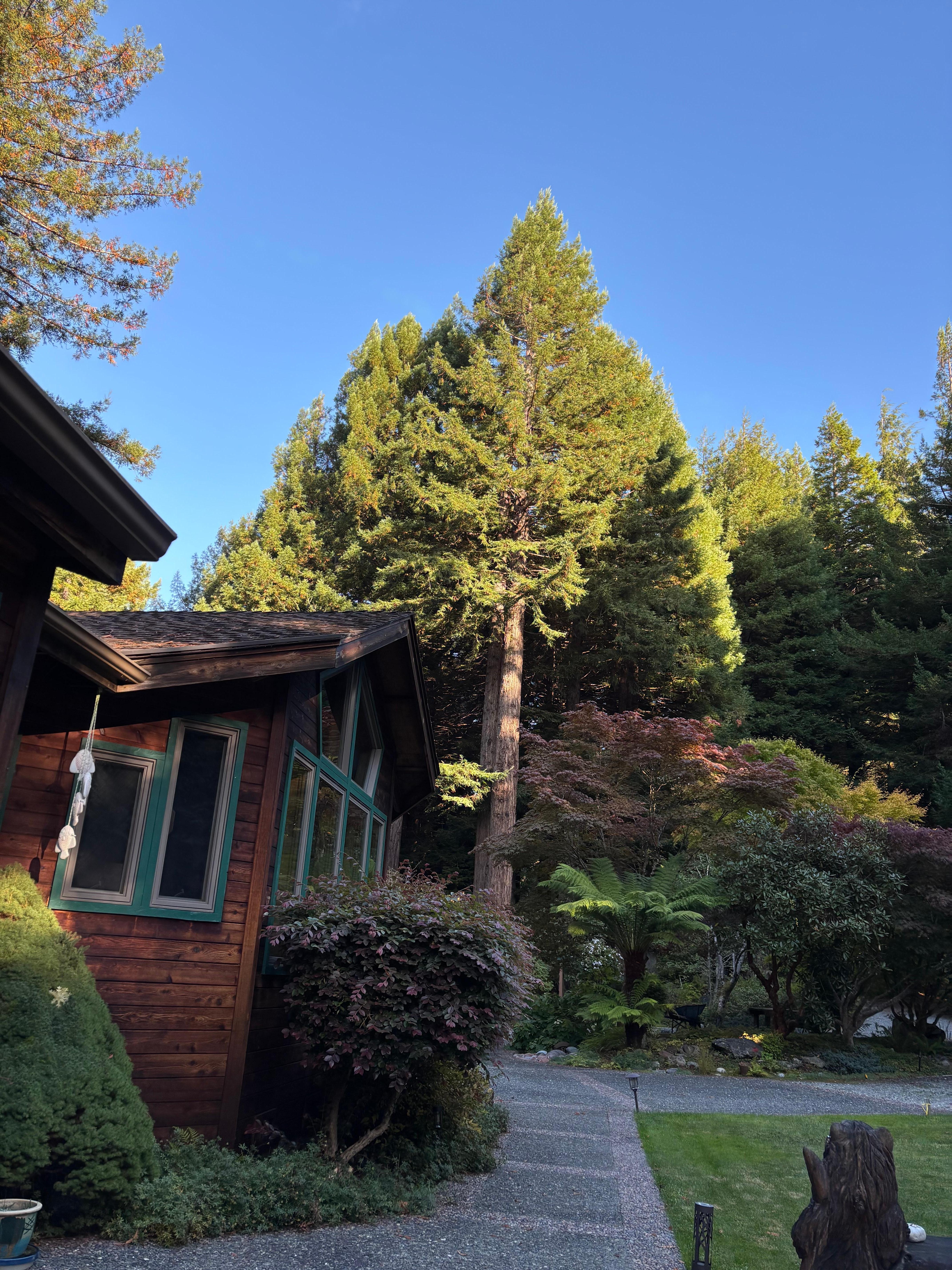 The natural setting in the redwoods has been complimented with groomed native plants, cedars, and Japanese maples. Rhododendrons (50+ of them!) start blooming in March and go on and on through May. Two ponds full of goldfish, water lilies and a pump-powered waterfall between them are a perfect place to have lunch and a chance to glimpse a threatened species, the red-legged frog or Pacific giant salamander. The large lawn is perfect for bocce ball or croquet. The backyard is a lush shade garden, full of ferns, Japanese variegated grass and more rhododendrons and Japanese maples. From there, the forest drops off towards McConnahas Mill Creek. This is the home that you will long to return to year after year.