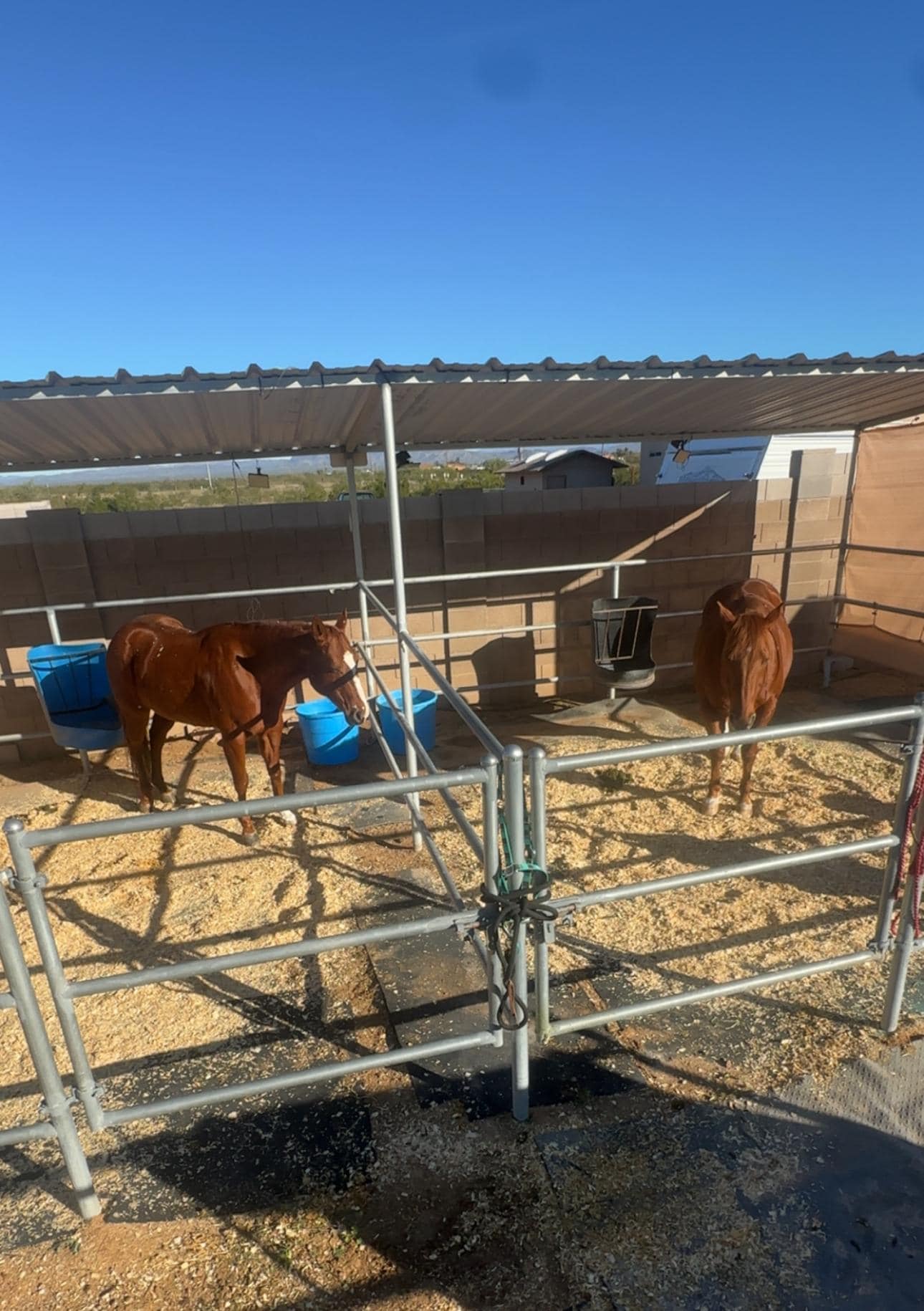 The back yard has fencing and can accommodate 2-3 horses. With two covered stalls.