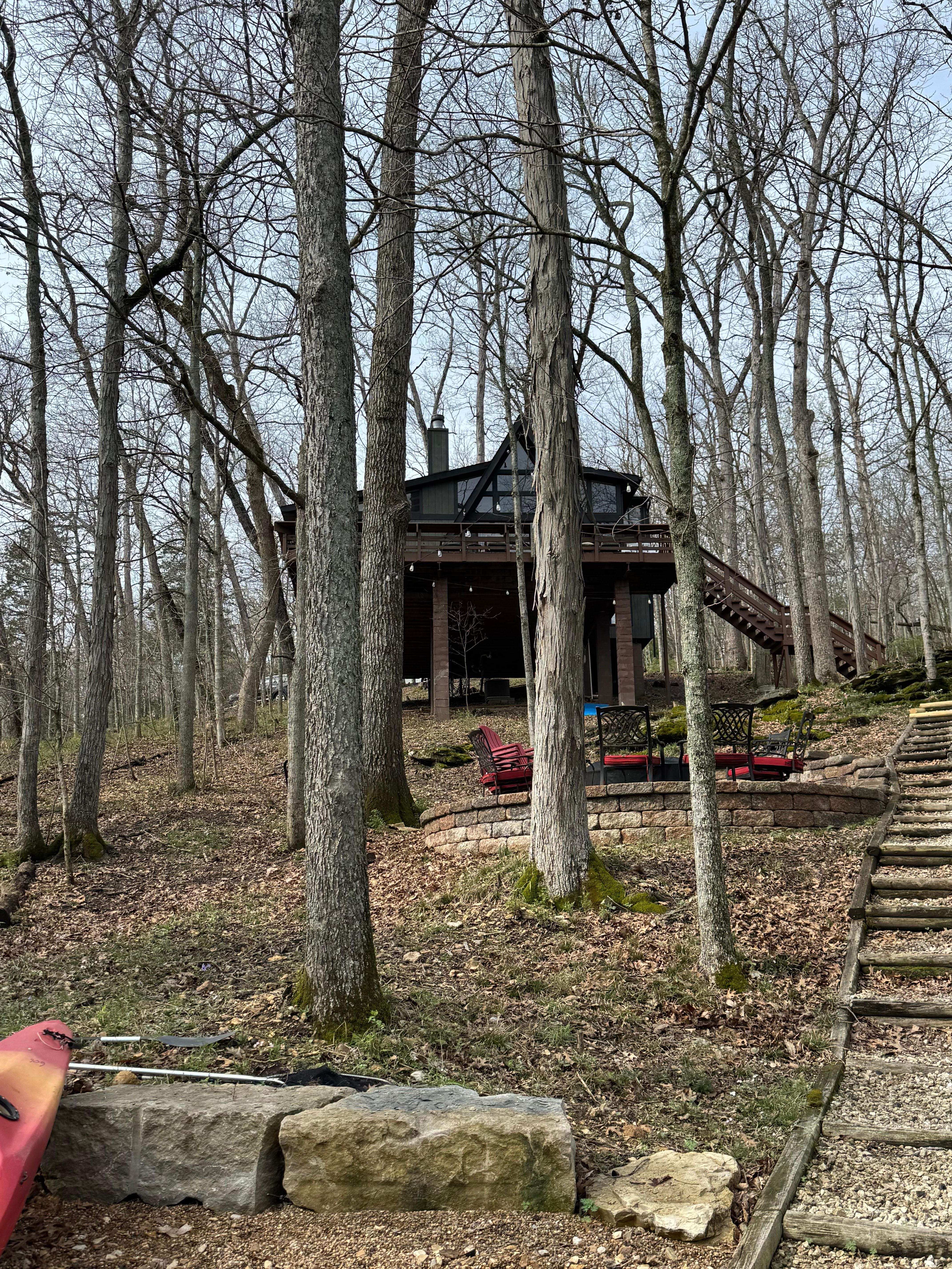 Through the sliding glass doors, step outside to the back deck that provides ample seating and the perfect place to soak in Midwestern sunsets. You and your guests can sit back and relax with your favorite evening beverage, or watch the kids enjoying the water activities at the lake below. Plus, the outdoor sitting area provides an additional outdoor entertainment space for people of all ages! So what are you waiting for? Experience a completely private, woodland inspired vacation the Innsbrook Vacations way in this one-of-a-kind rustic chalet!
